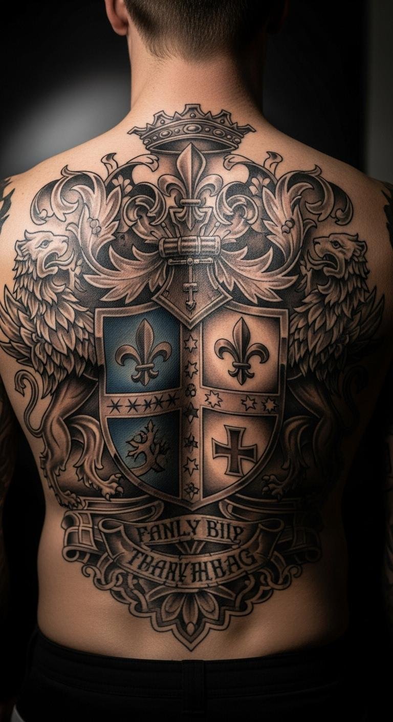 A family crest on your back honors roots. It builds connection. Draw simple crests on paper. Use free online creators for customization. Go small to keep costs down. For example, base it on family photos you have. Crests mean legacy, so include key items. Position it on your shoulder for ease. Choose monochrome for savings. Talk to local artists about options. This tattoo keeps family close.