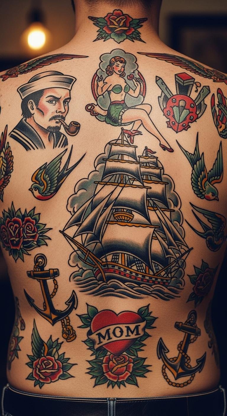 Sailor Jerry styles sail onto your back. They echo history. Draw ships on paper. Try free retro templates. Go for icons to save. For example, copy from vintage ads. These mean adventure, so add personal flair. Anchor them on sides. Use traditional shades. Find themed studios. Your back charts old seas.