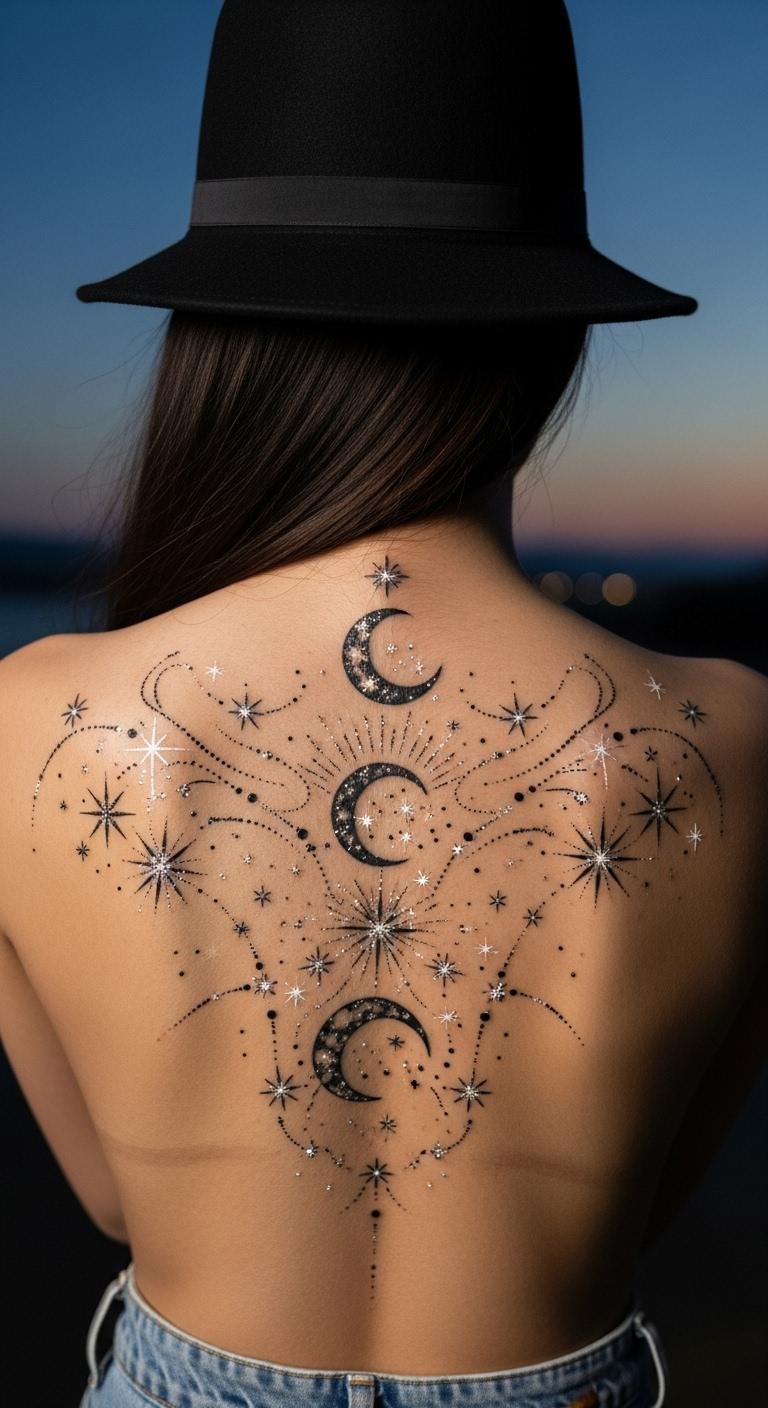 Stars and moons light up your back with mystery. They spark wonder every day. Draw starry skies on paper at night. Use free apps to align phases of the moon. Keep it cheap with dot work. For instance, practice with star stickers on your mirror. These symbolize dreams, so pick your favorites. Place them along your spine for flow. Go minimal to cut costs. Find deals through online artist directories. Your back becomes a night sky.