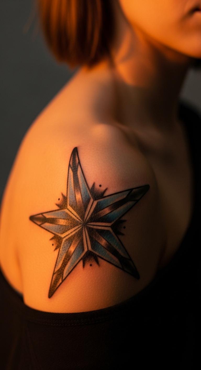 A shaded star tattoo adds depth on your shoulder. Layer shadows for effect. It’s for textured looks. Draw shades. Book deals. Use basics. This design pops. Experiment simply. It’s engaging.