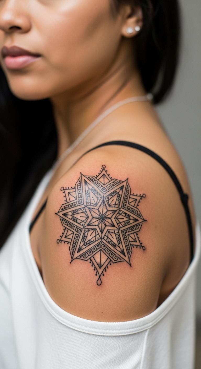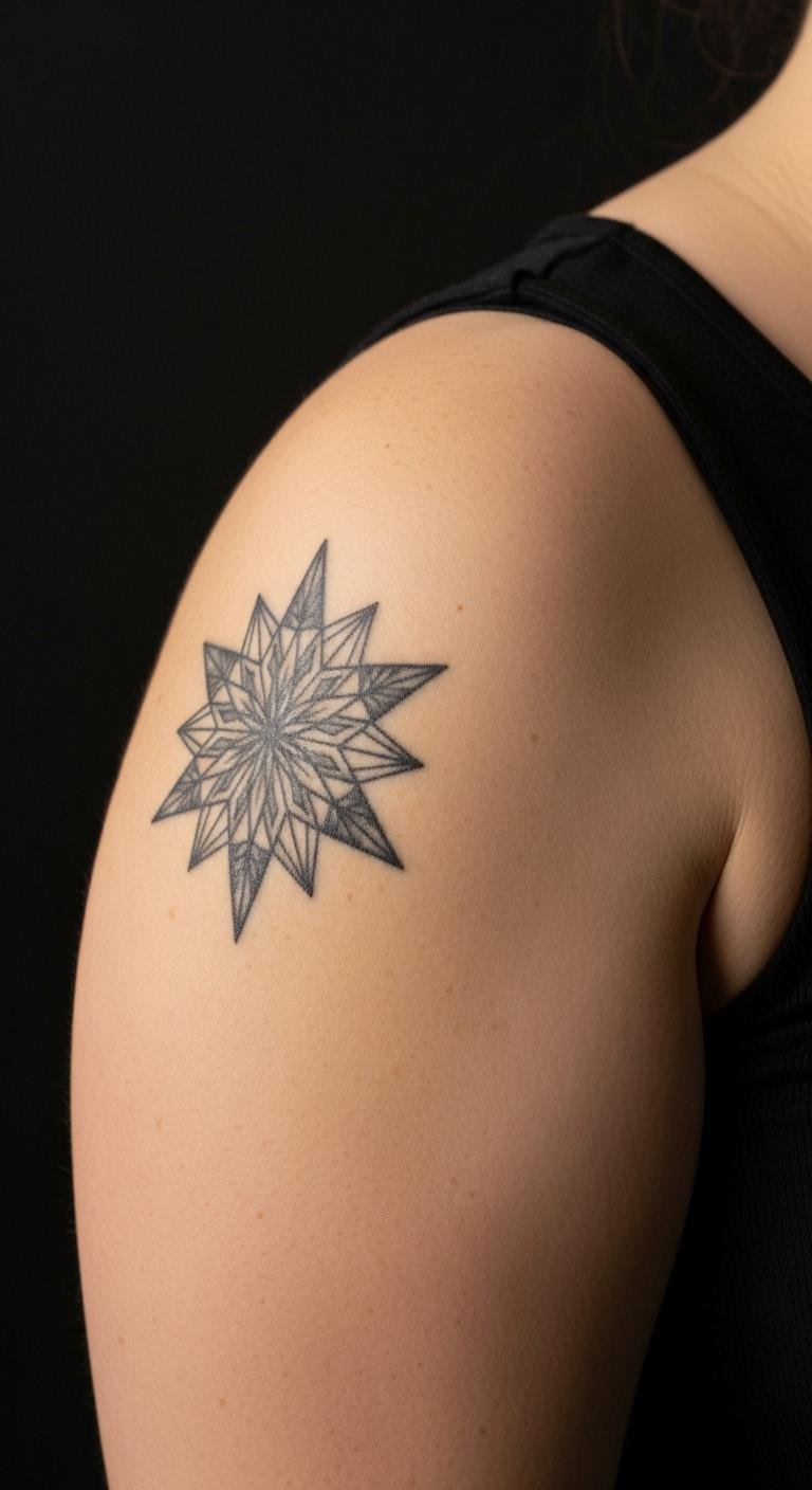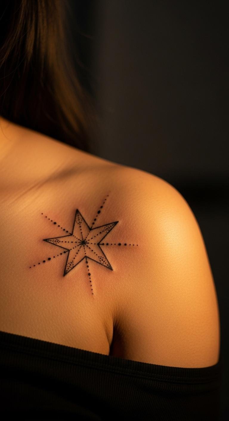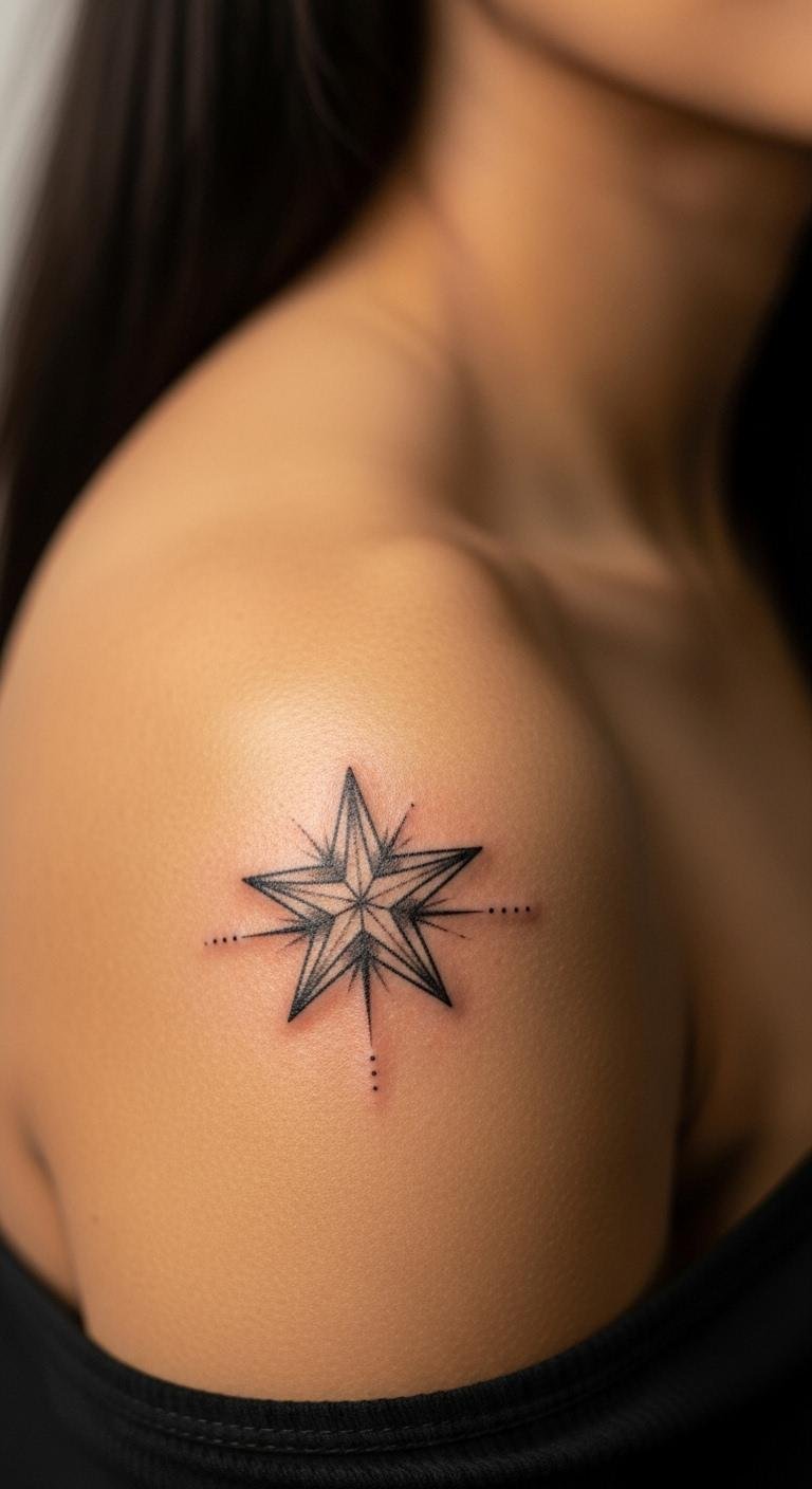 A geometric star tattoo offers modern symmetry on your shoulder. Think sharp angles forming a star shape for a cool edge. It’s perfect for women who like structured designs. Draw grids on paper to plan it out. Look for artists with package deals starting at $120. Go for black and gray to save on ink. Build the design step by step at home with a ruler. This tattoo fits under work shirts or shows off at events. Pair it with simple jewelry for extra style. Opt for a medium size for balance and ease. It’s a straightforward choice that enhances your confidence without much effort.