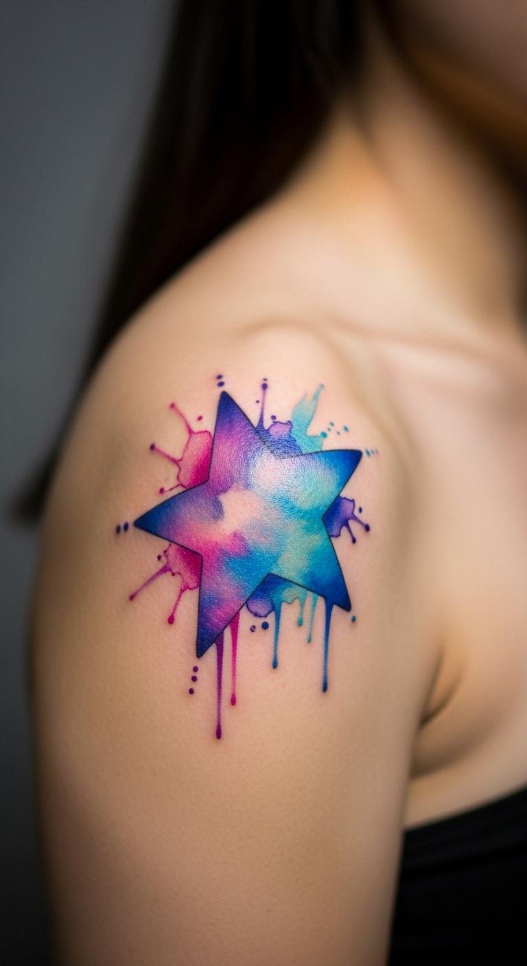 A watercolor star tattoo brings art to your shoulder with flowing colors. Imagine soft blues and pinks blending around a star for a dreamy effect. It’s ideal if you love creative vibes. Start by coloring a star sketch with markers at home. Find deals on colored ink sessions for about $150. Choose a compact design to cut costs. Apply it in one go for less time in the chair. Use household items like aloe for simple care. This style pops with casual outfits, adding fun to your look. Experiment with color swatches on paper first. It’s a fresh way to express yourself affordably. Keep the star small for easy maintenance and quick healing.