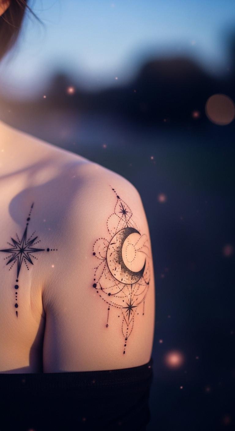 A celestial theme tattoo mixes stars with moons on your shoulder. Picture stars and crescents for a night sky feel. It’s ideal for women who connect with the universe. Draw constellations on paper as a start. Seek out sales on thematic designs around $130. Use fewer elements to keep it cheap. Protect it with common lotions afterward. This tattoo complements evening outfits, adding wonder to your day. Experiment with star placements at home. It’s a simple way to feel inspired without overcomplicating things. Choose stars that align with your story for lasting appeal.