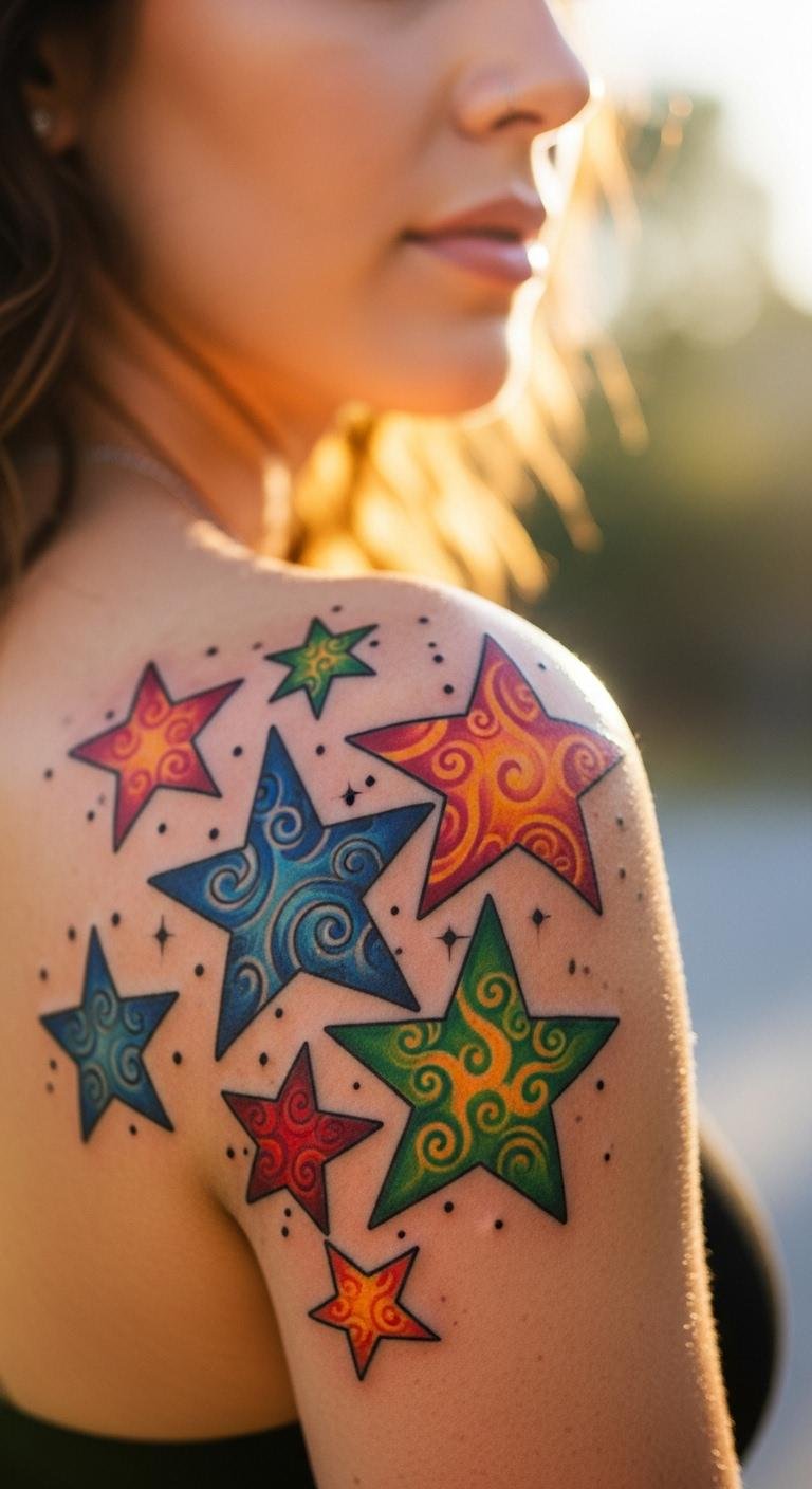 A colorful star tattoo adds vibrancy to your shoulder. Think a star in reds and yellows for a bold pop. It’s suited for women who embrace fun designs. Color in a star drawing with crayons to plan. Look for pigment specials starting at $140. Opt for fewer colors to save money. Heal it with kitchen remedies like honey. This tattoo pairs with colorful tops, boosting your outfit. Test shades on paper first. It’s a cheerful choice that fits any budget. Focus on bright centers for an eye-catching effect.