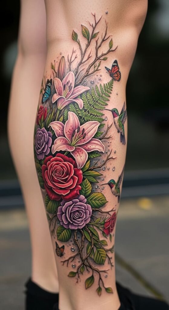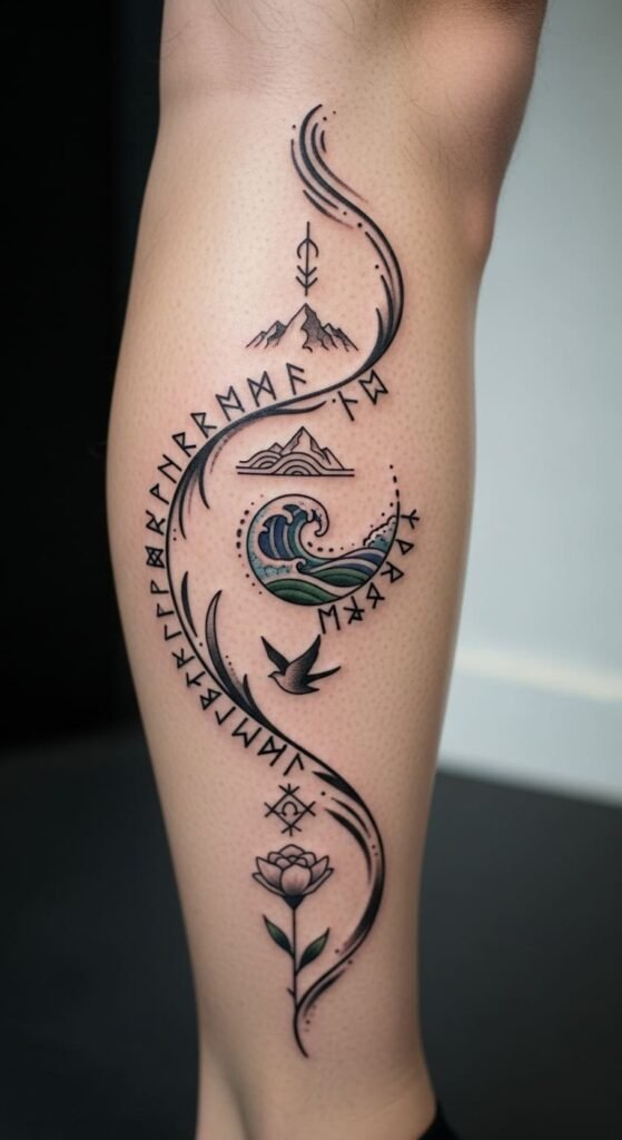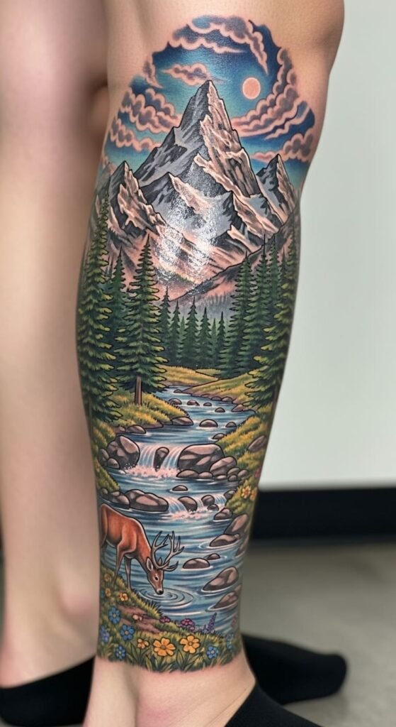 Mountains or waves on your calf capture outdoor vibes. They use layers for a scenic effect. Sketch landscapes from photos at home. Find nature-themed artists with deals. Bold this: nature scenes bring peace affordably. Keep it simple: Choose your favorite view. Put it on the curve. Use travel pics for ideas. This DIY step is fun. Go for outlines to save. Discuss with the pro. You’ll feel at one with it.