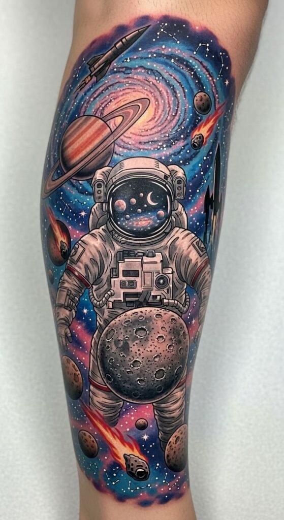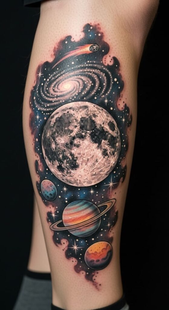 Planets and orbits on your calf add a space touch. They feature rings for depth. Draw solar systems on paper quickly. Seek out cosmic deals online. Bold these: celestial details explore without expense. Break it up: Pick your planet. Locate it smartly. Use space apps for designs. This makes it engaging. Keep it compact. Talk to the artist. Your tattoo will be out of this world.