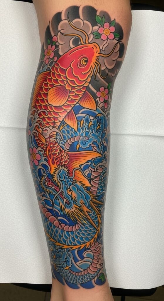 Japanese styles with koi or dragons make your calf stand out. These use colorful details for a cultural twist. Practice drawing fish shapes with pencils at your desk. Seek out artists with package deals for these themes. Bold this: Japanese motifs add depth affordably. Keep it practical: Pick a design that fits your story. Place it lower on the calf for discretion. Use books or sites for free ideas. This DIY prep saves time and money. Go for black and gray to cut costs. Share your thoughts with the expert. You’ll get a tattoo that’s both cool and personal.