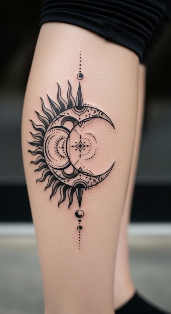 Pair sun and moon on your calf for a balance of light and dark. These symbols use simple curves for harmony. Draw circles and crescents at home with a ruler. Look for online artists offering discounts on pairs. Bold this: sun and moon designs work for any wallet. Keep sentences clear: Think about what they mean to you. Place them side by side on your calf. Use free drawing tools on your phone. This DIY trick helps you decide fast. Opt for outline versions to save cash. Discuss with the tattoo pro for tweaks. You’ll love the symbolic touch.