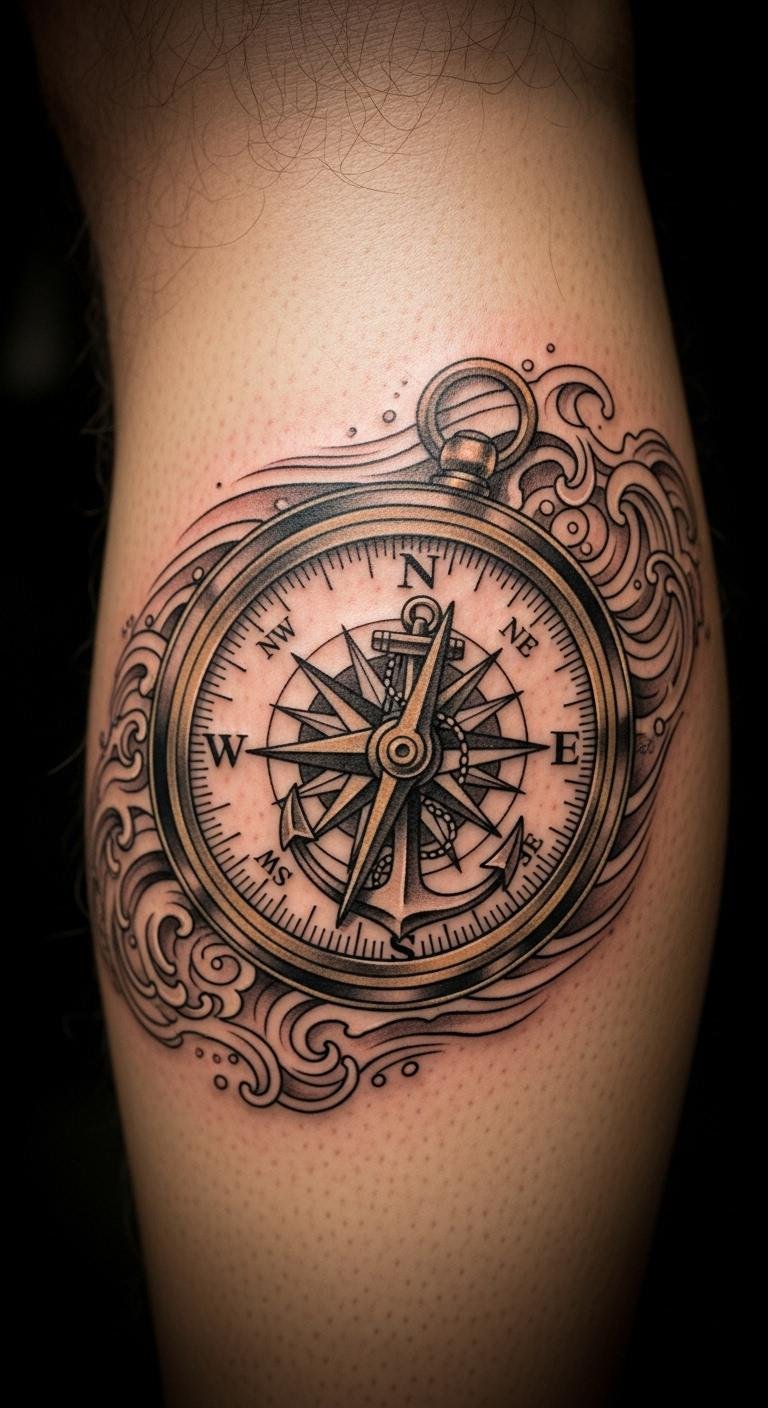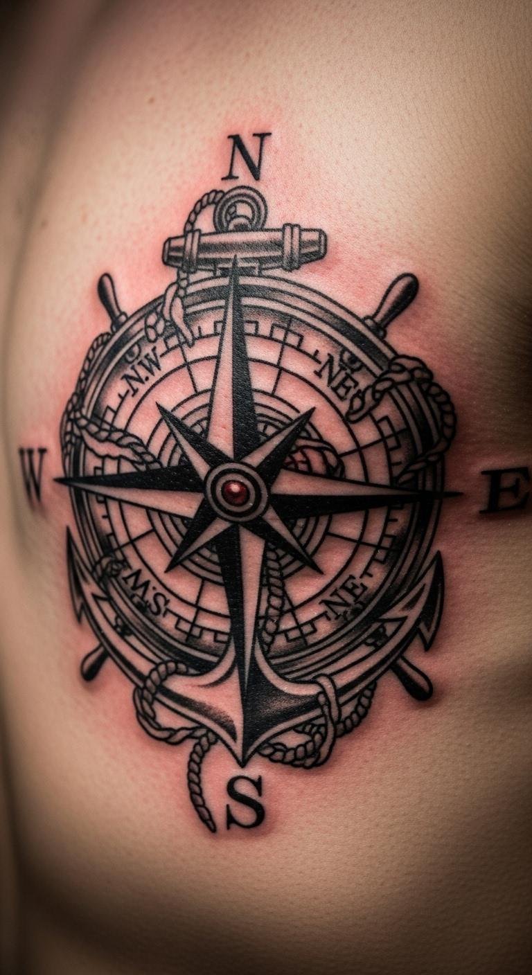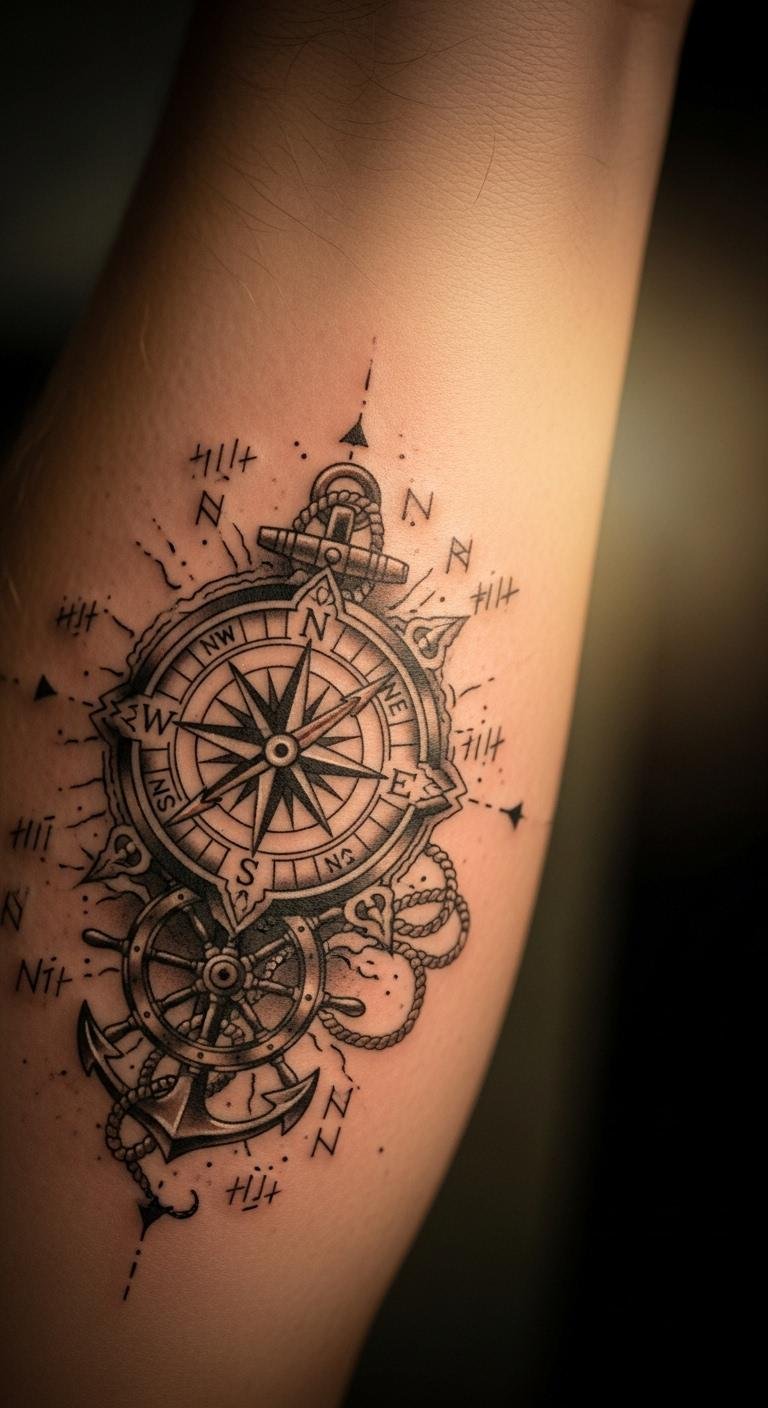Go for waves and ropes around your compass to capture travel vibes. Place it on your shoulder for that explorer feel. Sketch ideas at home with free online templates—print and trace on paper. Budget tip: Look for artists offering deals under $100 for smaller sizes. Add elements like a ship wheel for extra flair, using affordable stickers as practice. This setup suits trips or new starts, keeping things light and fun. Bold the key: nautical compass. Opt for quick appointments to fit your schedule. It’s a simple way to celebrate journeys without complex prep.