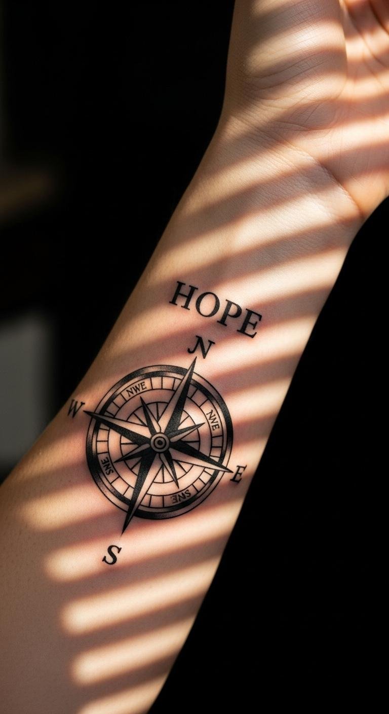 Add rays for hope. Forearm for visibility. Sketch rays. Save with $60. Include rays—practice. Bold the key: hope compass. Ideal for positivity, handle fast. Make it practical.