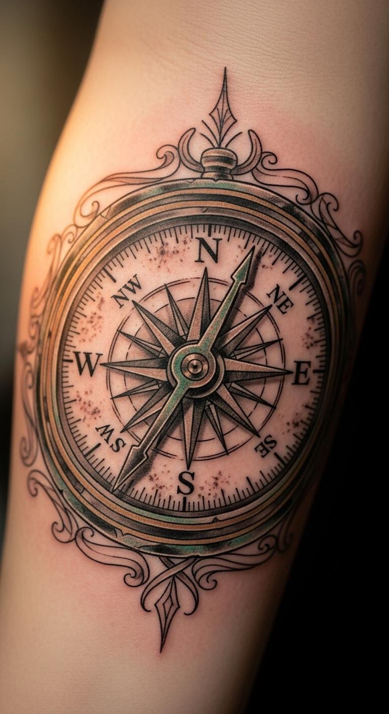 Add worn edges to your compass for an old-school feel. Try your forearm for easy viewing. Grab vintage-inspired stencils online for free and copy them. Keep costs down at about $70 with nearby artists. Include a small anchor—test with henna kits from the store. Bold the key: vintage compass. This works for history buffs, done in a single, relaxed session. Focus on quick, fun tweaks.