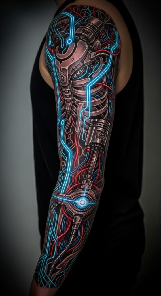 Cyberpunk tattoos mix tech elements like circuits with organic twists for a sci-fi vibe. Imagine gears blending with nature for a unique edge. Draw rough versions on paper to see how they flow. For affordable routes, seek artists who do digital consultations to cut visit costs. A small circuit on your wrist might only cost $80. Place these on tech-friendly spots like the shoulder. Use free software to design your own before the appointment. Keep designs simple to stay under budget. Quick idea: Test with temporary tattoos first—they’re cheap and reusable.