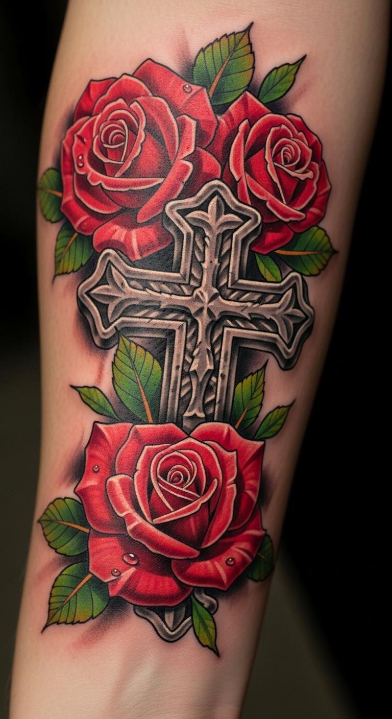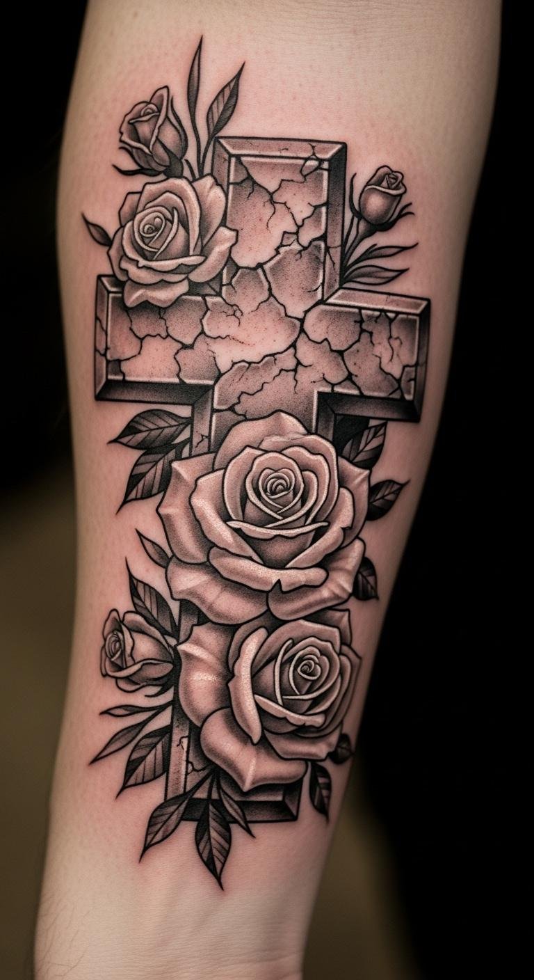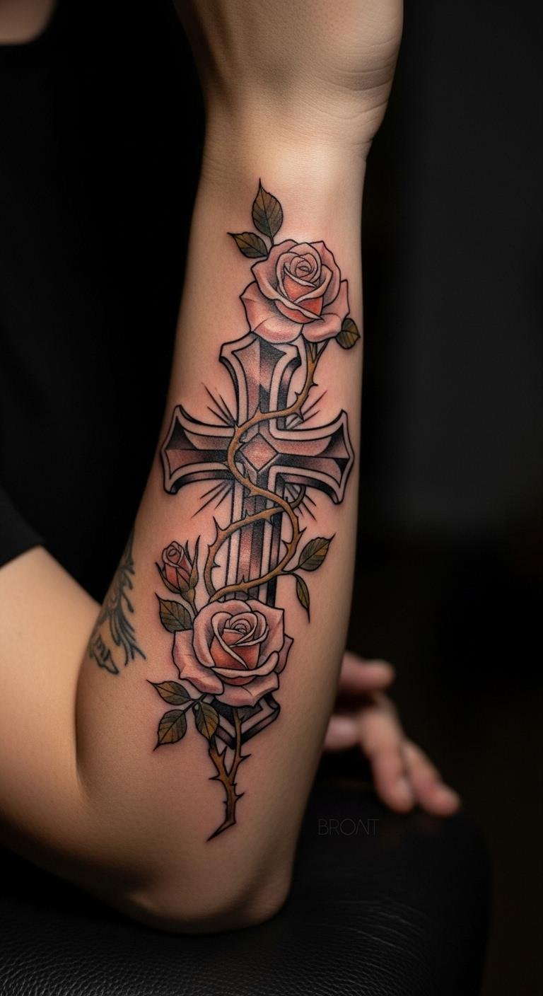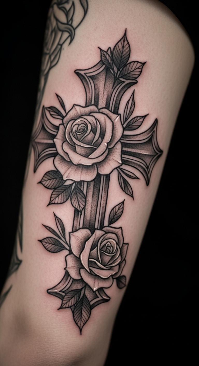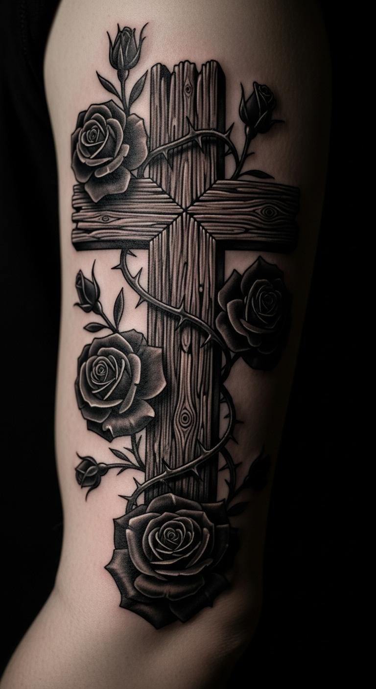 Think simple yet powerful. A black and grey cross with roses keeps things understated. Start with a basic outline on your arm for a clean look. This style lasts long without fading fast. Go for a local artist who offers affordable sessions—many charge under $100 for small pieces. Add a personal twist, like a small vine, using sketches from free online apps. Break it down: pick a design, sketch it out, and book a spot. You’ll appreciate how it ages gracefully. Keep costs low by avoiding extra colors. Real talk: this is easy to maintain with daily moisturizing. Try a temporary sticker first to test it. Bold the key: black and grey for timeless vibes. It’s a smart choice for first-timers.