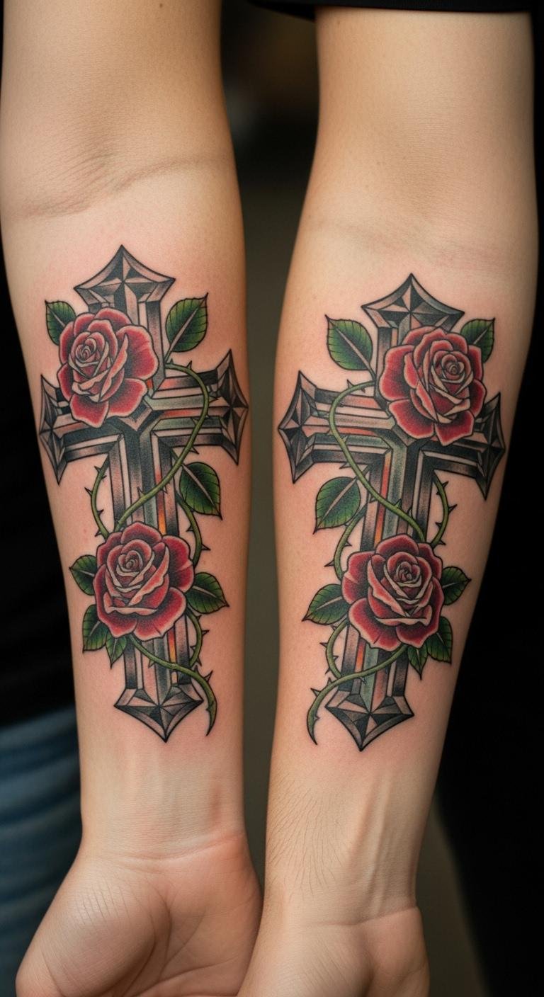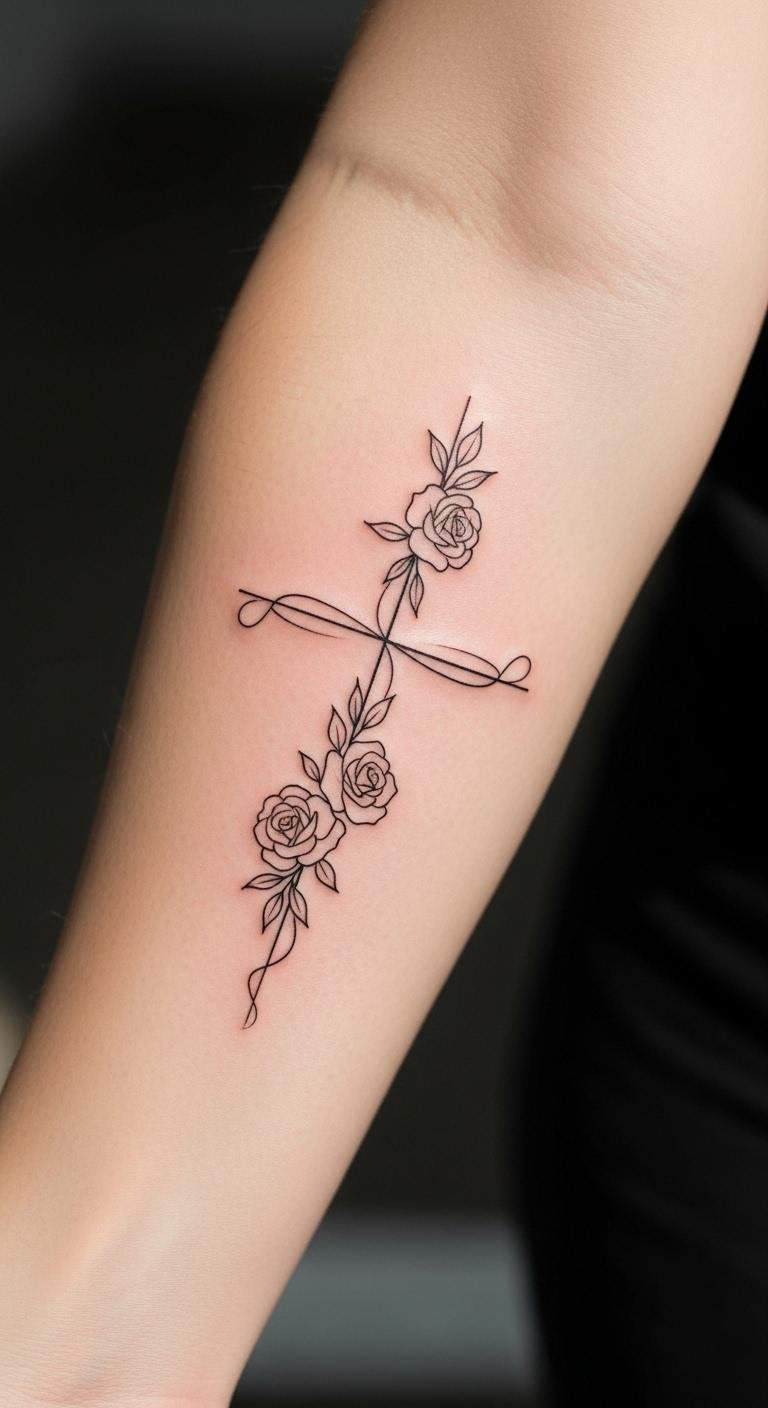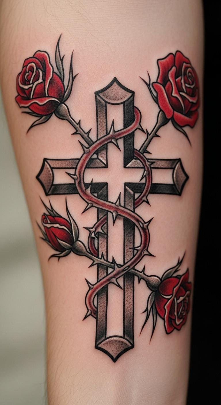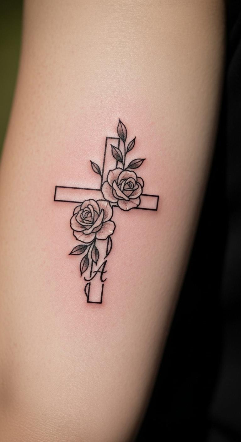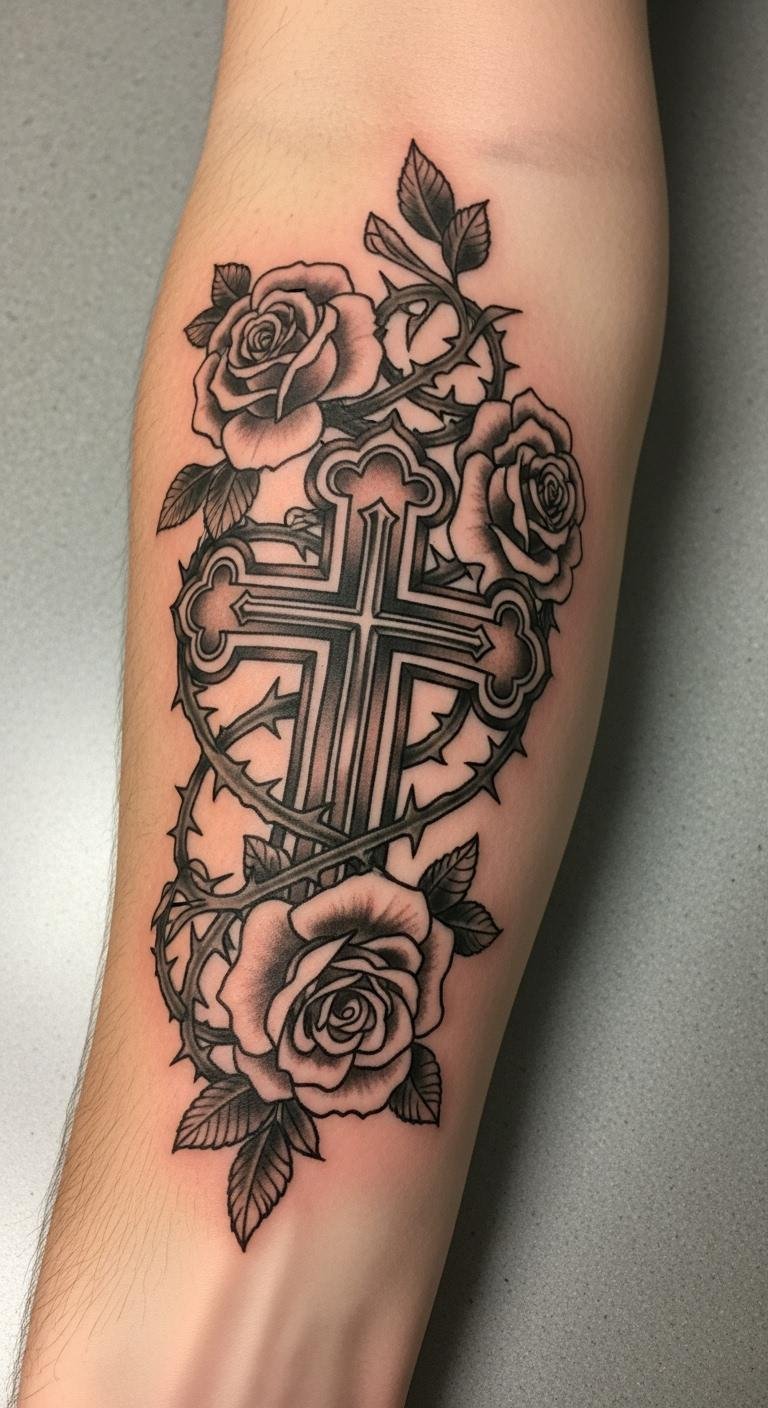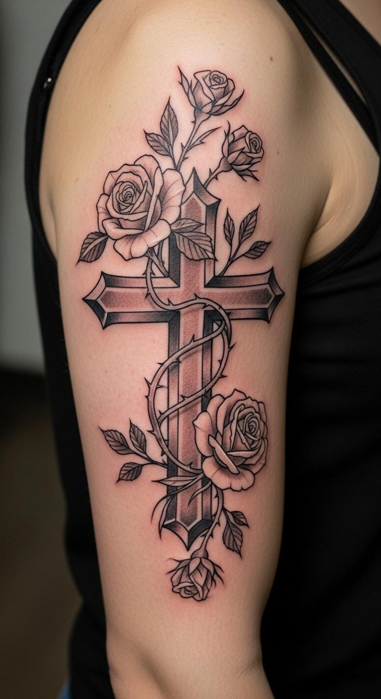 Think simple yet powerful. A black and grey cross with roses keeps things understated. Start with a basic outline on your arm for a clean look. This style lasts long without fading fast. Go for a local artist who offers affordable sessions—many charge under $100 for small pieces. Add a personal twist, like a small vine, using sketches from free online apps. Break it down: pick a design, sketch it out, and book a spot. You’ll appreciate how it ages gracefully. Keep costs low by avoiding extra colors. Real talk: this is easy to maintain with daily moisturizing. Try a temporary sticker first to test it. Bold the key: black and grey for timeless vibes. It’s a smart choice for first-timers.