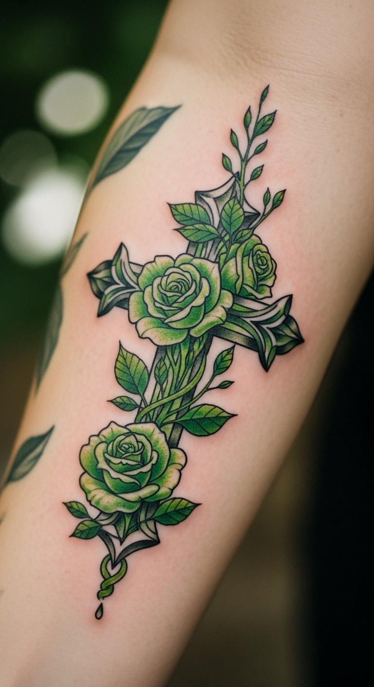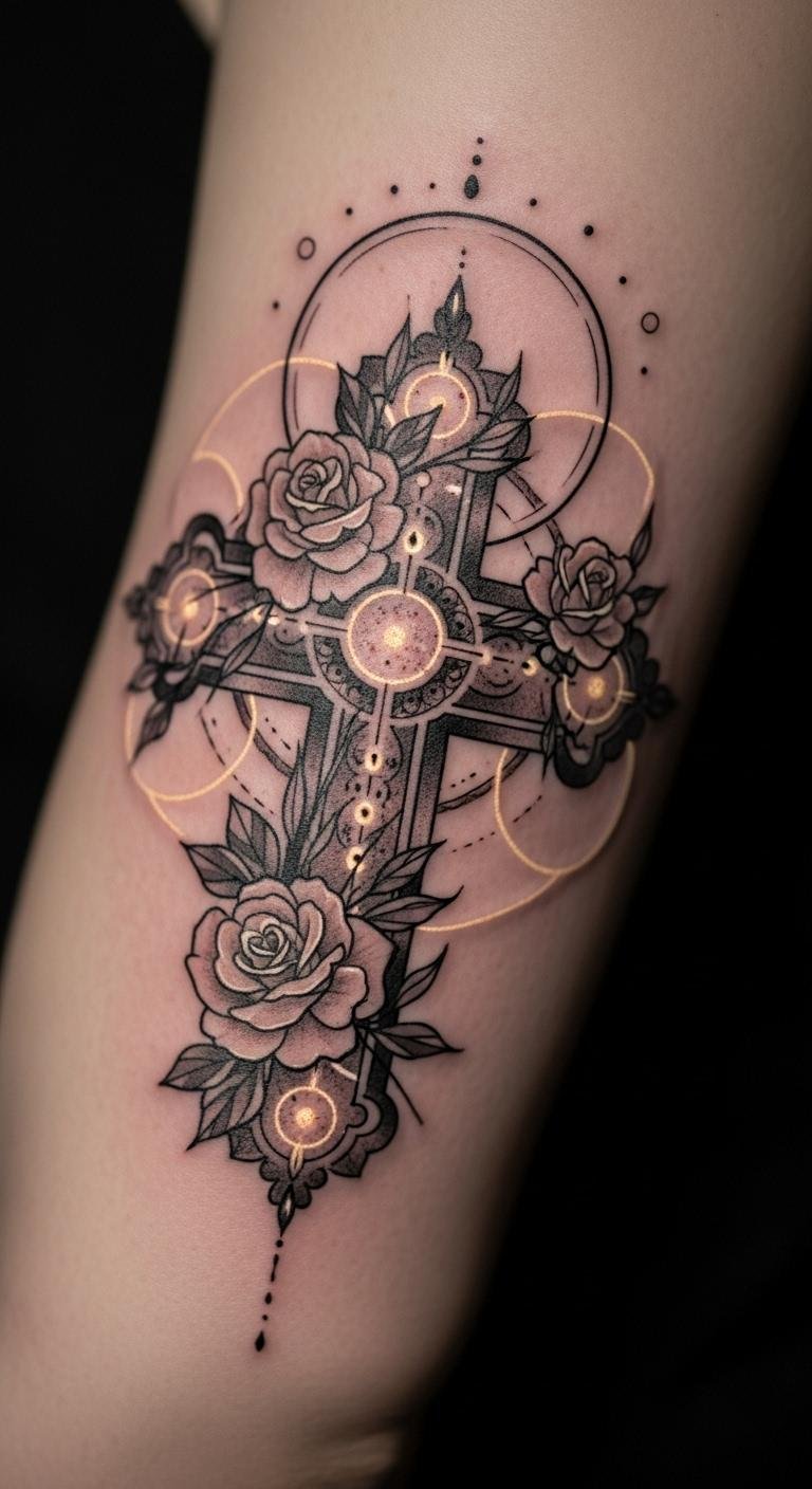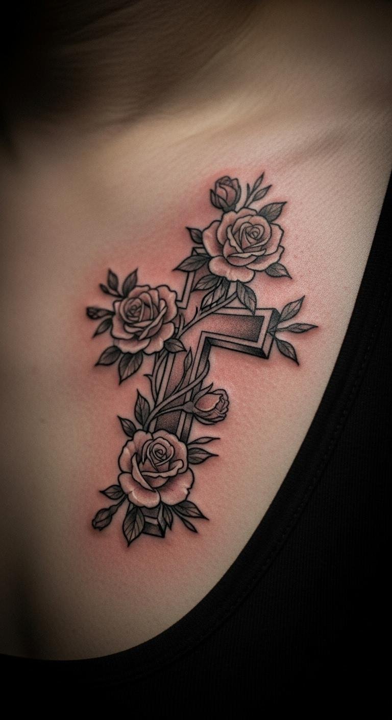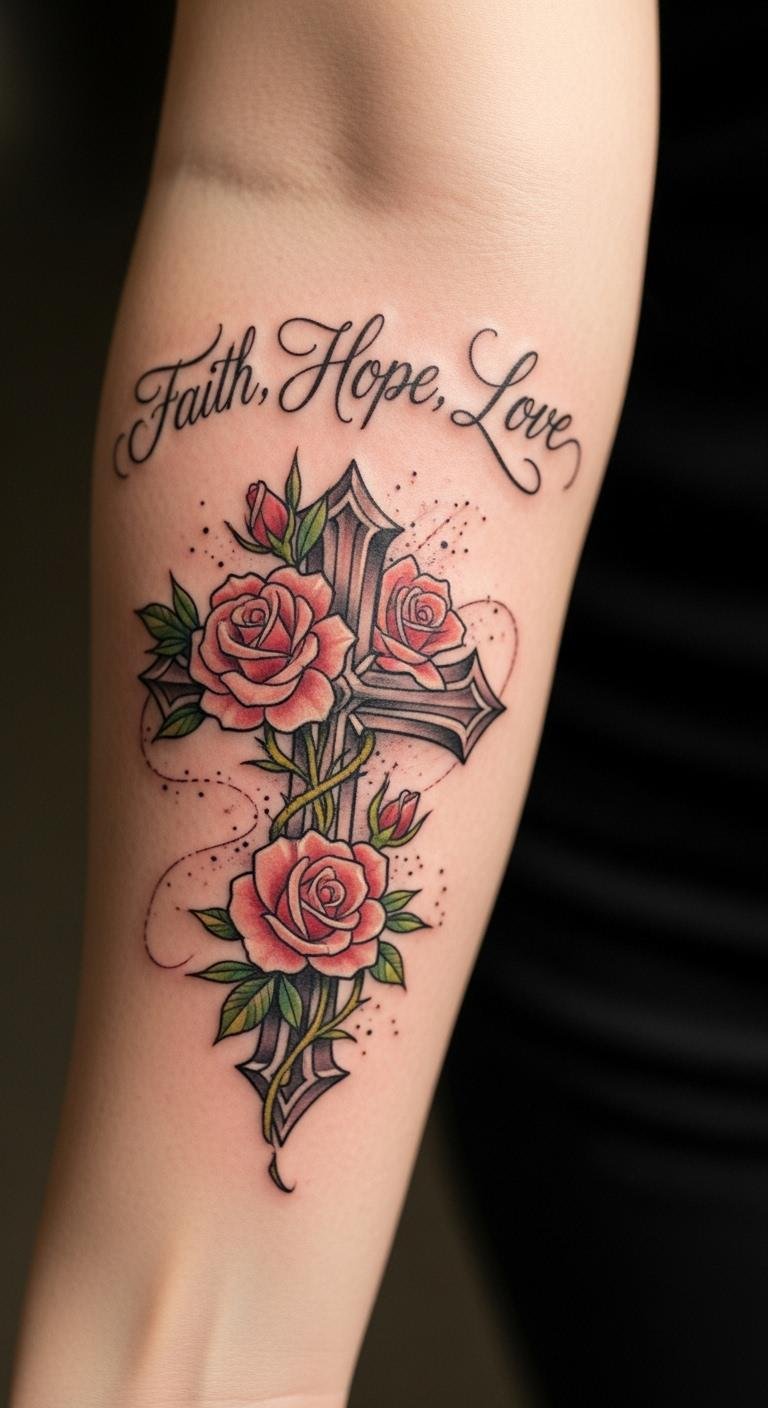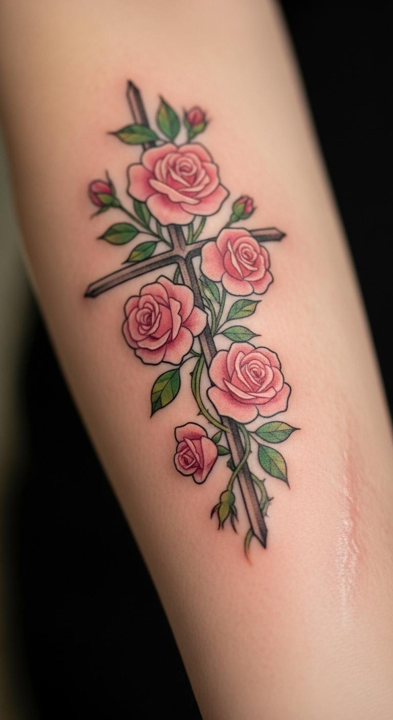 Think simple yet powerful. A black and grey cross with roses keeps things understated. Start with a basic outline on your arm for a clean look. This style lasts long without fading fast. Go for a local artist who offers affordable sessions—many charge under $100 for small pieces. Add a personal twist, like a small vine, using sketches from free online apps. Break it down: pick a design, sketch it out, and book a spot. You’ll appreciate how it ages gracefully. Keep costs low by avoiding extra colors. Real talk: this is easy to maintain with daily moisturizing. Try a temporary sticker first to test it. Bold the key: black and grey for timeless vibes. It’s a smart choice for first-timers.
