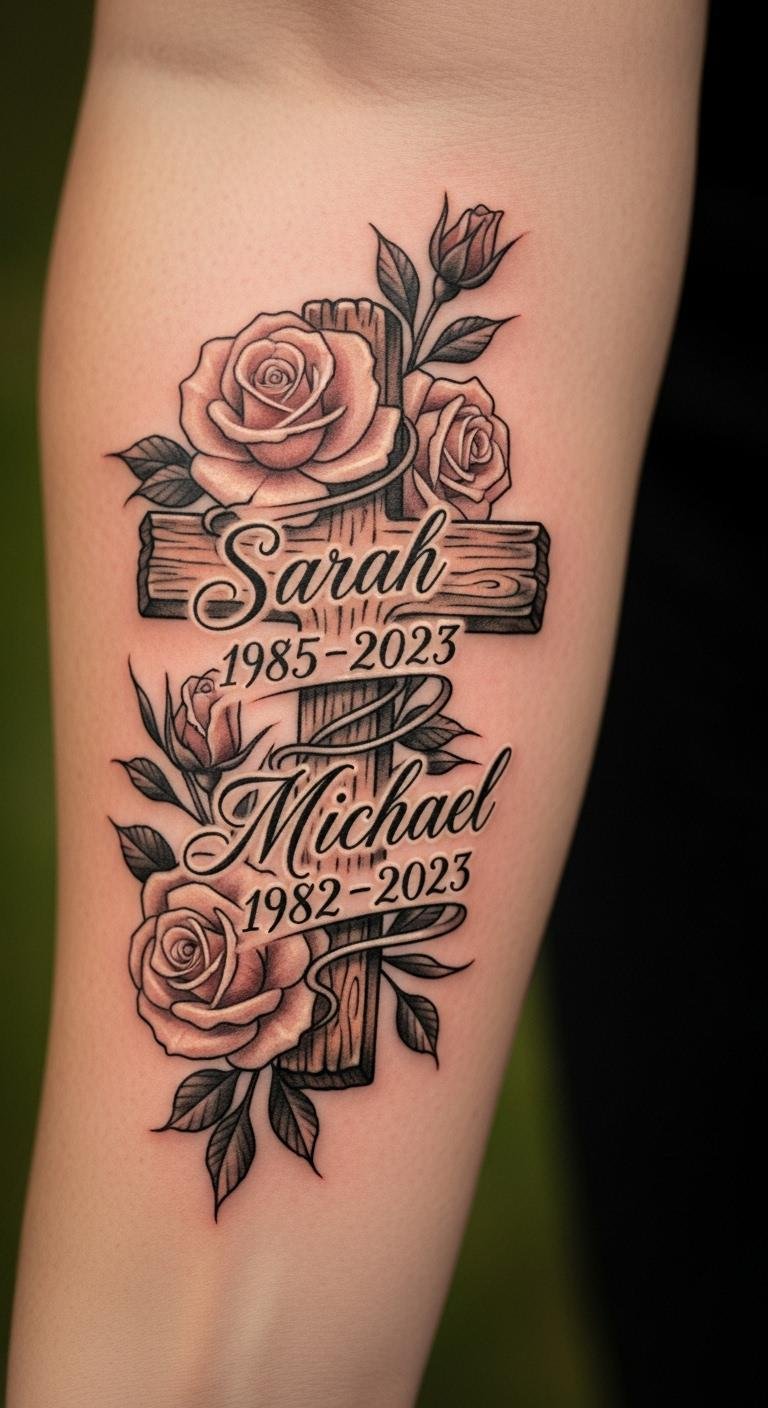 Honor someone with a cross, roses, and a short inscription. Arm placement keeps it close. Use free font apps for ideas. Find a local pro for custom work at $100 or less. Write the text yourself on paper. Test with stick-on letters first. Care for it with basic routines. Bold the feature: memorial inscription for remembrance. This adds heart without high costs.