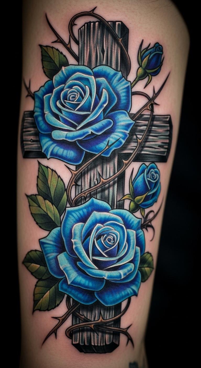 Choose blue roses with your cross for a mysterious feel. Arm enhances the look. Free blue designs online. Sessions at $70. Sketch blue shades. Test with blue markers. Protect colors daily. Bold the color: blue roses for mystery. Affordable twist.