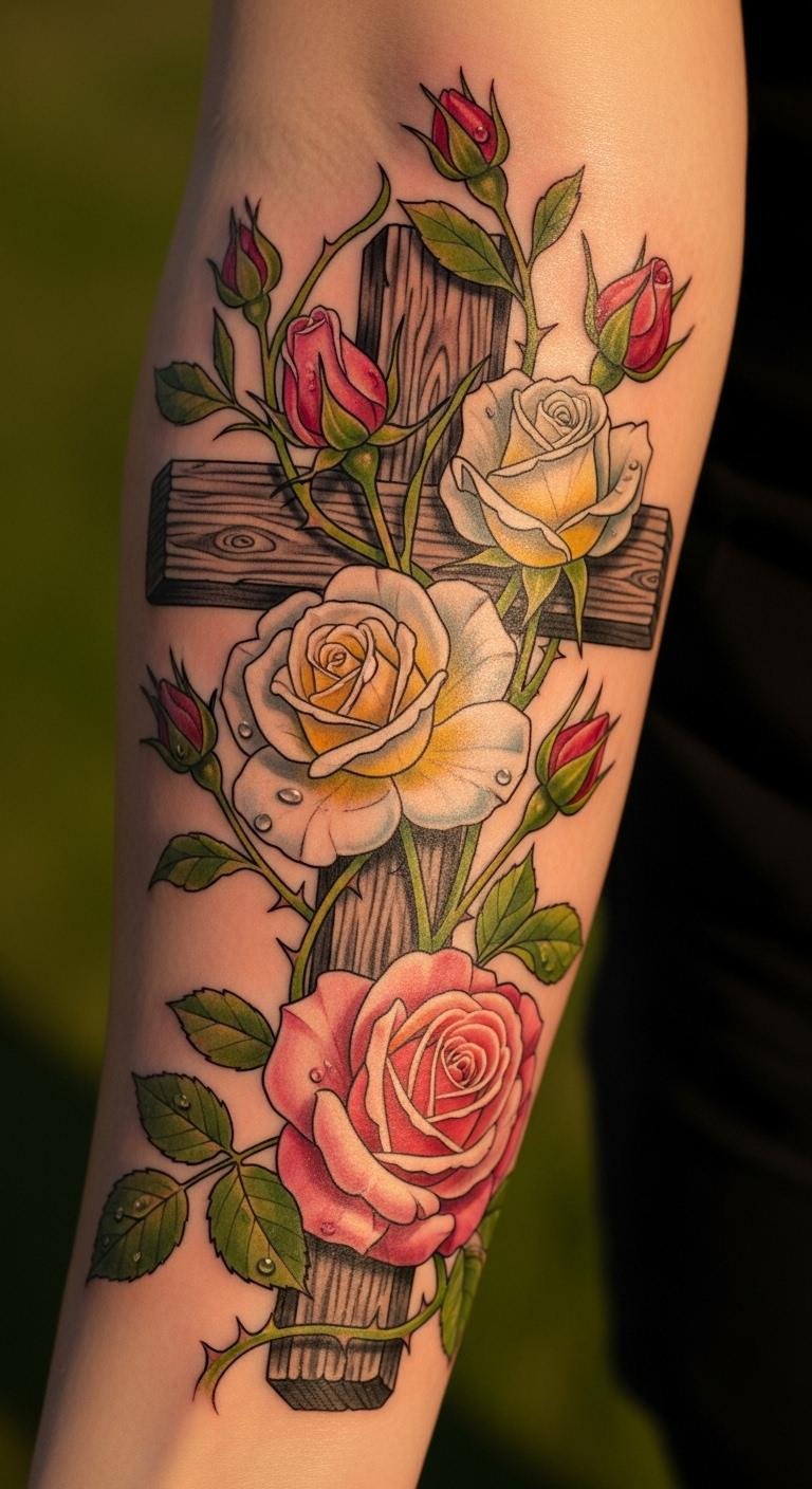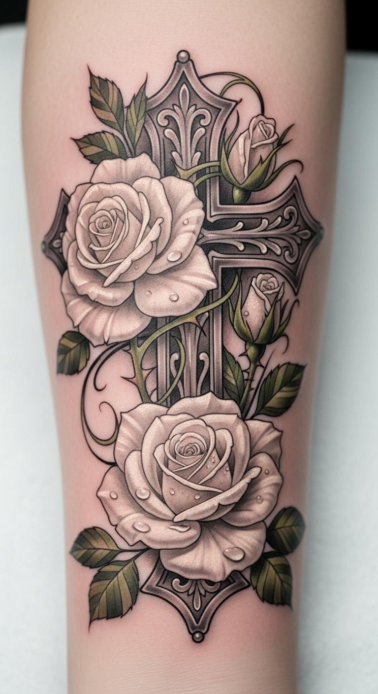 Opt for white roses with your cross for purity. Arm placement suits it. Free white templates online. Artists charge $80. Sketch white elements. Use white-out stickers. Keep it clean. Bold the tone: white roses for purity. Easy on funds.