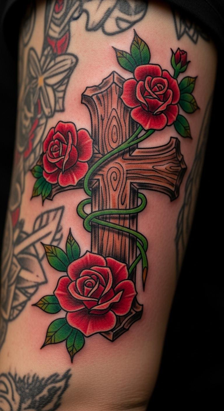 Position your cross with roses on the upper arm for easy show. This spot is practical for daily wear. Look up free placement guides. Get it done for $70 at a nearby shop. Measure your arm with a ruler. Use arm bands as a mock-up. Care with regular washing. Bold the spot: upper arm placement for access. It’s a simple choice.