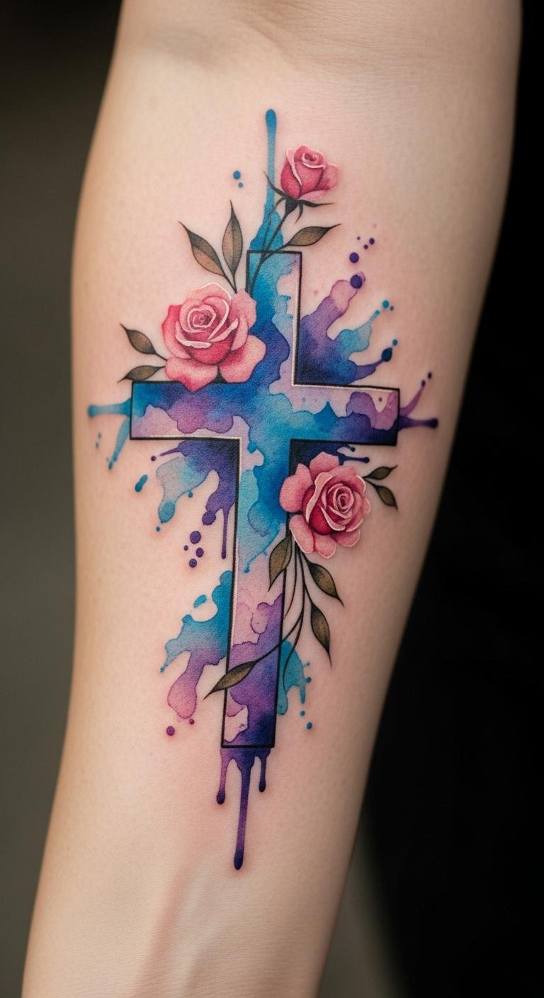 Get a watercolor effect for your cross and roses. Place on arm for a dreamy look. Use free apps for blend ideas. Artists often charge $90 for this. Experiment with watercolors on paper. Test with washable markers. Keep colors bright with simple lotions. Bold the effect: watercolor blends for art. Easy on the wallet.