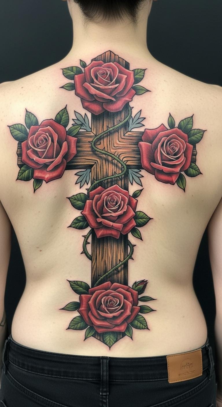 Go big with a detailed cross and roses on your back. This allows for more elements. Find free back templates online. Sessions might cost $120. Sketch on a mirror. Try a large temporary. Maintain with back creams. Bold the area: back design for space. Affordable for bigger ideas.