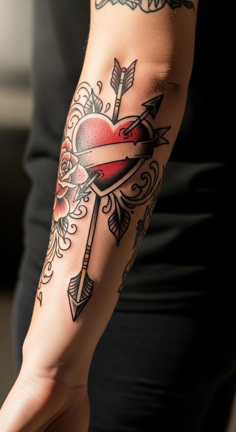 Heart and arrow tattoos speak of love and direction. They’re straightforward yet deep. Sketch hearts quickly. Use arrow ideas online. Find affordable pros. Keep it minimal. Build in parts. Use home care. This design guides you. Wear with heart-themed clothes. Personalize with initials. Take a sketch step.