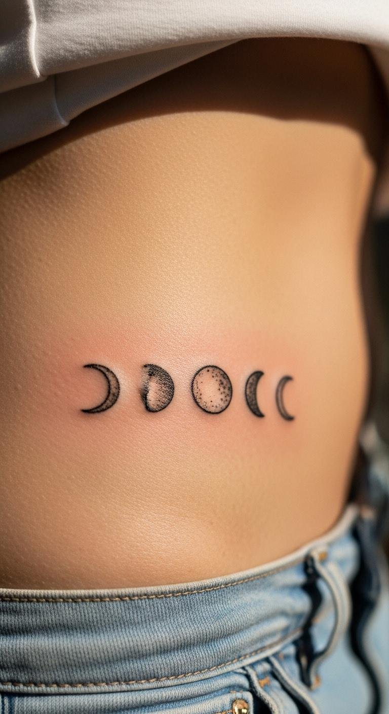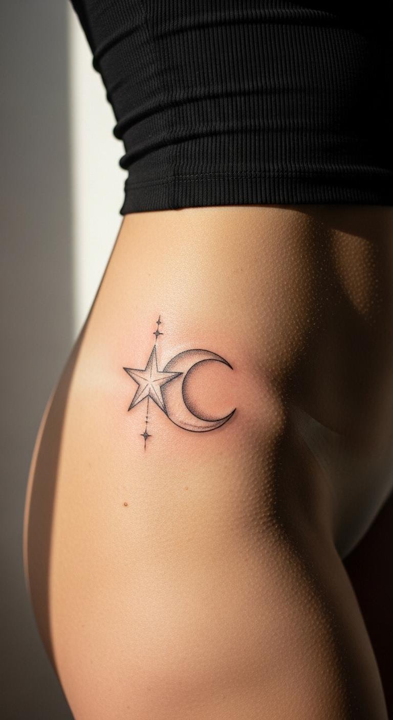 A minimalist moon on your hip captures change and calm in one clean line. These phases symbolize life’s cycles, making it a quiet nod to your journey. Sketch it out at home with a pen and mirror to fit your shape just right. Save money by using phone apps for virtual previews—no need for extras. Aim for a small design; prices start at $60 for something basic. Keep it simple: place it on the hip bone for a sleek flow. Add a personal element, like combining it with a star if that speaks to you. This tattoo boosts your style by feeling empowering yet discreet. Test with stick-on versions from the dollar store first. Focus on aftercare basics, like keeping it clean with soap you already have. You’ll love how it looks peeking out from daily outfits.