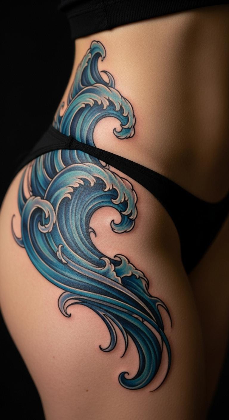 Waves on your hip capture motion and emotion abstractly. Plan with doodles. Online resources help. Budget $70. Fit to curve. Add twists. It’s dynamic. Try drawings. Simple healing. Empowering flow.
