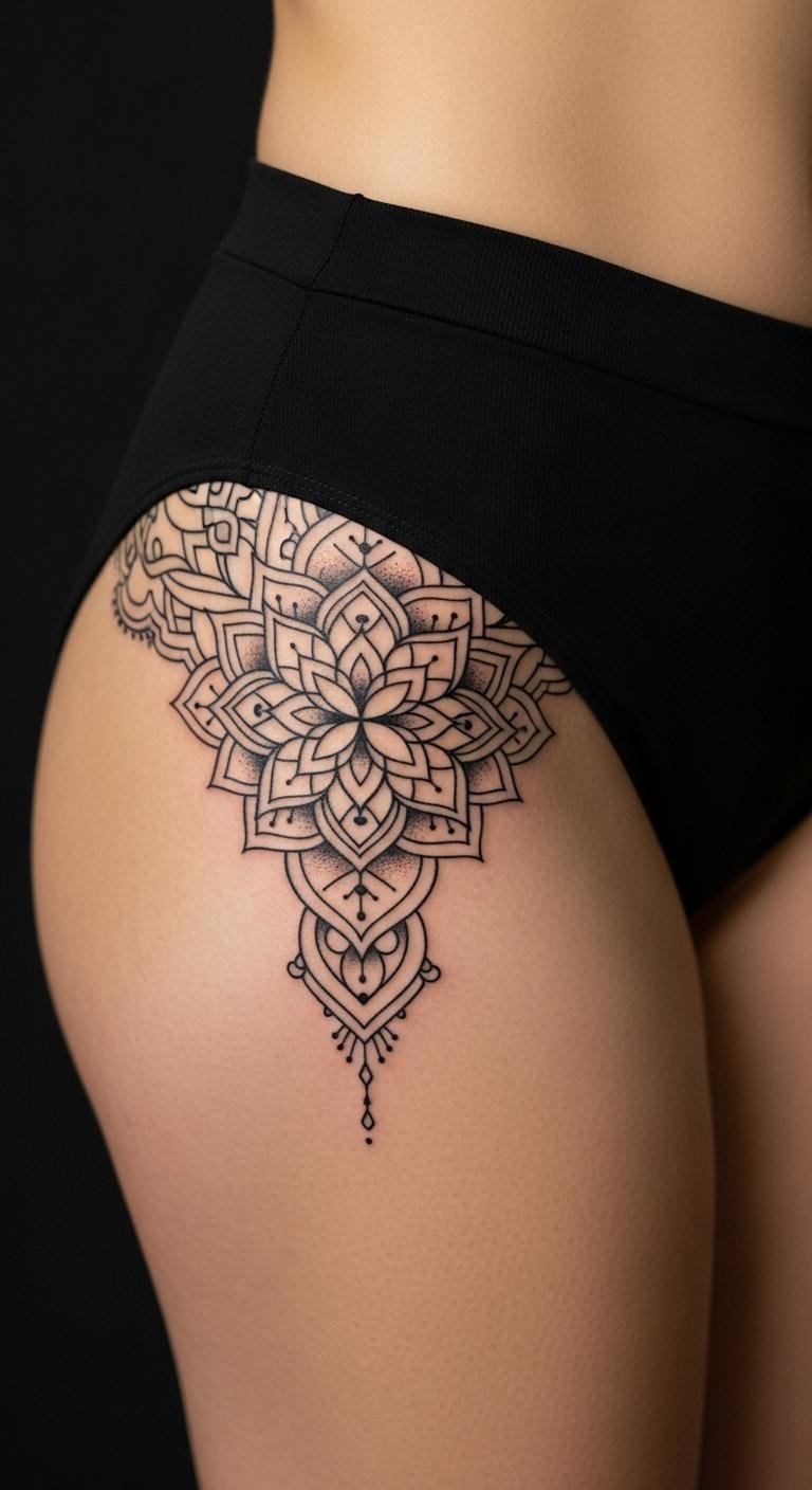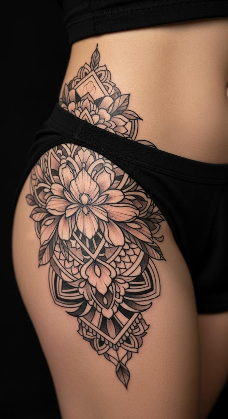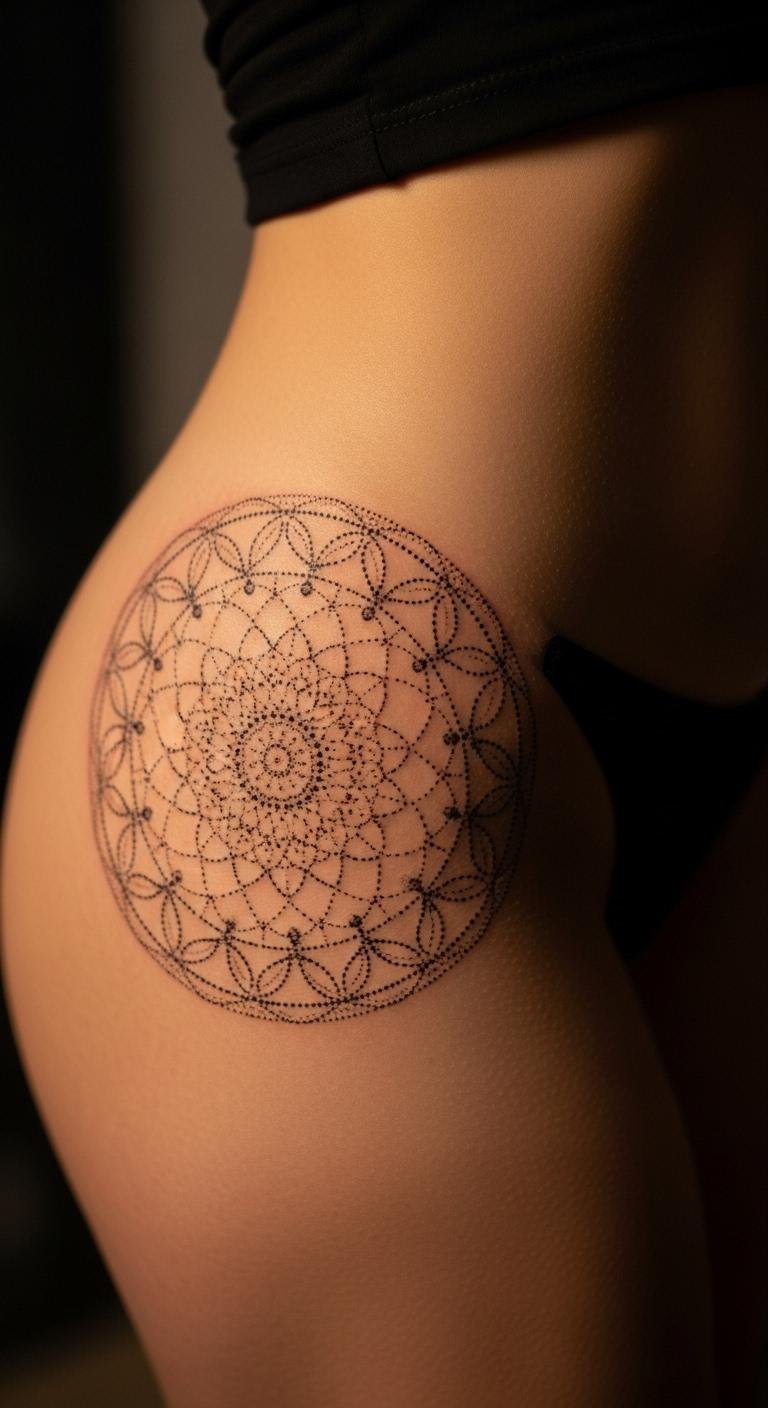 A geometric mandala on your hip offers balance and peace through its shapes. It draws from spiritual vibes, making it deeply personal. Plan ahead by tracing simple patterns on paper at no cost. Use affordable digital tools to mix designs before committing. Prices range from $80 for a basic one. Place it on the curve for enhanced flow. Make it yours by adding a unique twist, like extra dots. This tattoo empowers your style with its symmetry. Test with printable stencils you can find online for free. Keep healing straightforward with clean bandages from home. It’s a subtle way to show your inner strength.