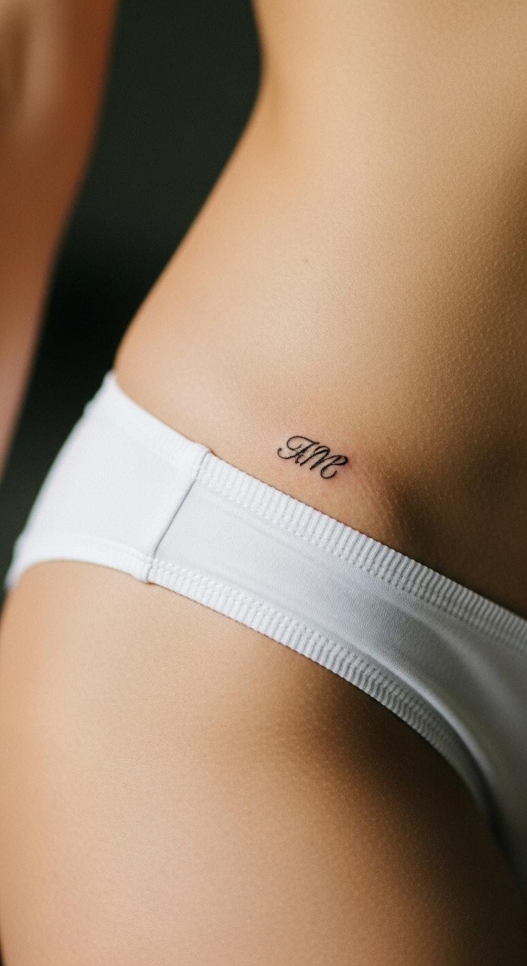 Initials in script on your hip keep it personal. Write ideas. Free fonts online. $50. Discreet spot. Customize letters. It’s intimate. Stickers help. Simple healing. Your mark.