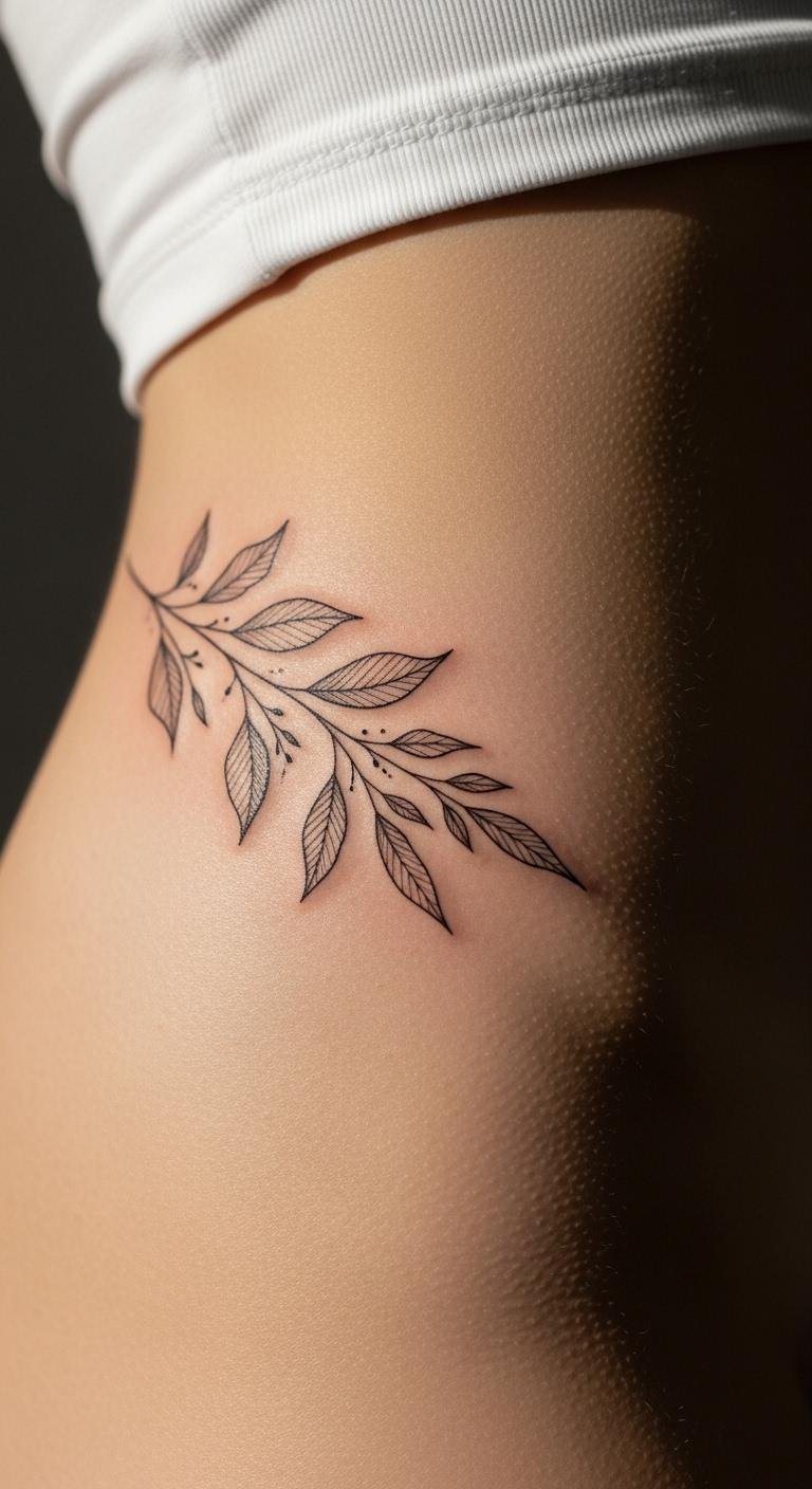 A branch with leaves on your hip means new beginnings. Draw branches. Free resources. $60. Flow with body. Add leaves. It’s fresh. Temporary options. Basic healing. Growth symbol.
