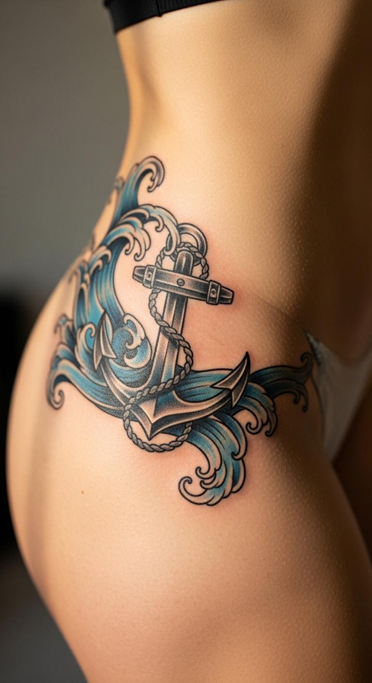 An anchor with waves on your hip means stability. Plan anchors. Online waves. $70. Hip curve. Personal waves. It’s steady. Test with drawings. Basic aftercare. Strong symbol.