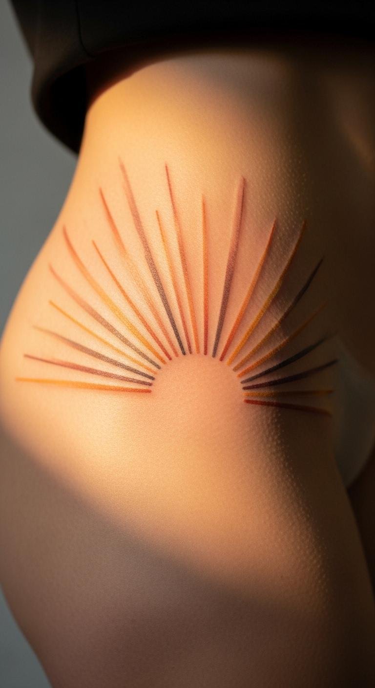Sun rays on your hip brighten your day. Draw rays. Free designs. $60. Radiate out. Customize rays. It’s uplifting. Temporary tries. Simple healing. Sunny power.