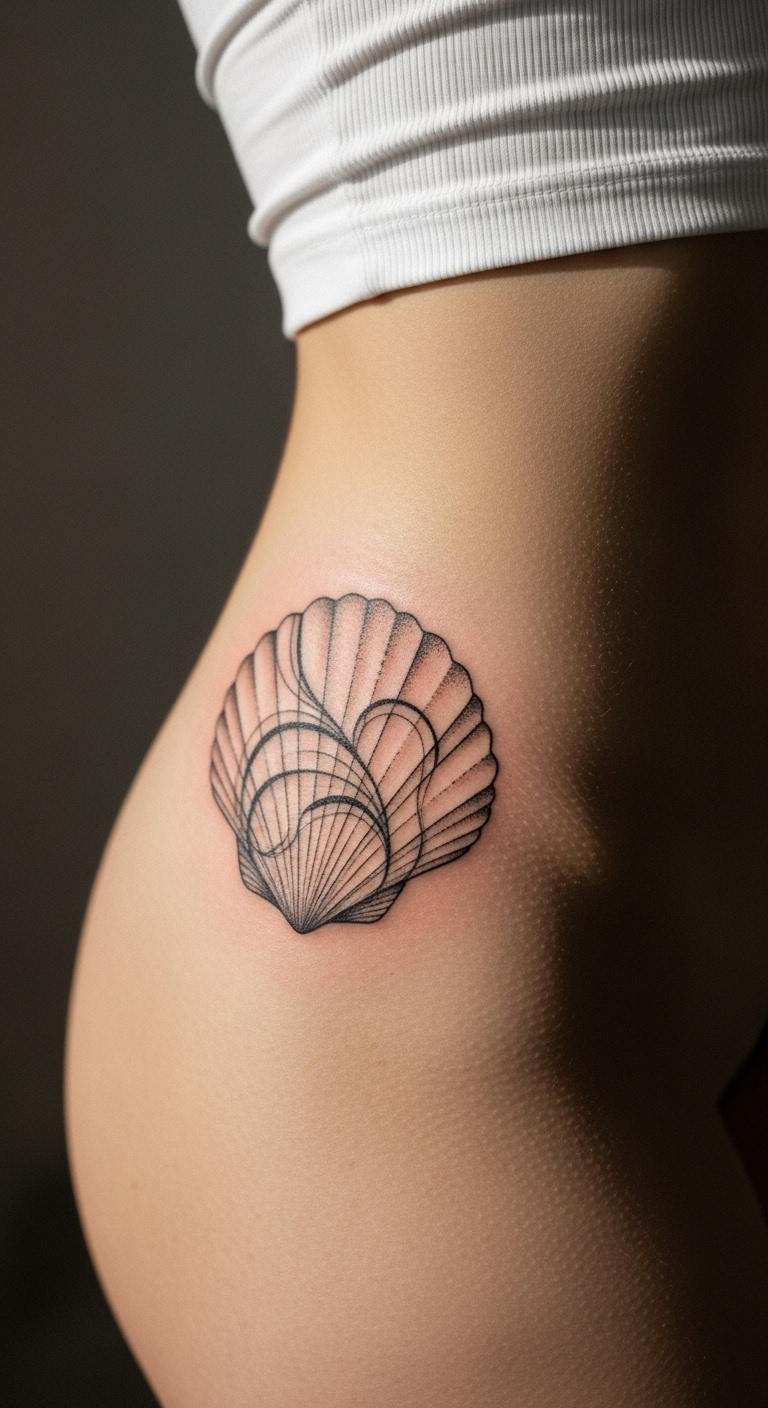 A shell tattoo on your hip evokes the sea’s calm and adventure in a simple form. It’s about grounding and exploration. Sketch shells from beach photos you already have. Opt for free nature apps to visualize it first. Budget around $50 for this design. Curve it with your hip’s shape for a natural fit. Add waves if it fits your vibe. This tattoo highlights your connection to nature. Experiment with drawing it on with eyeliner. Heal with everyday creams. Wear it as a badge of your journeys.