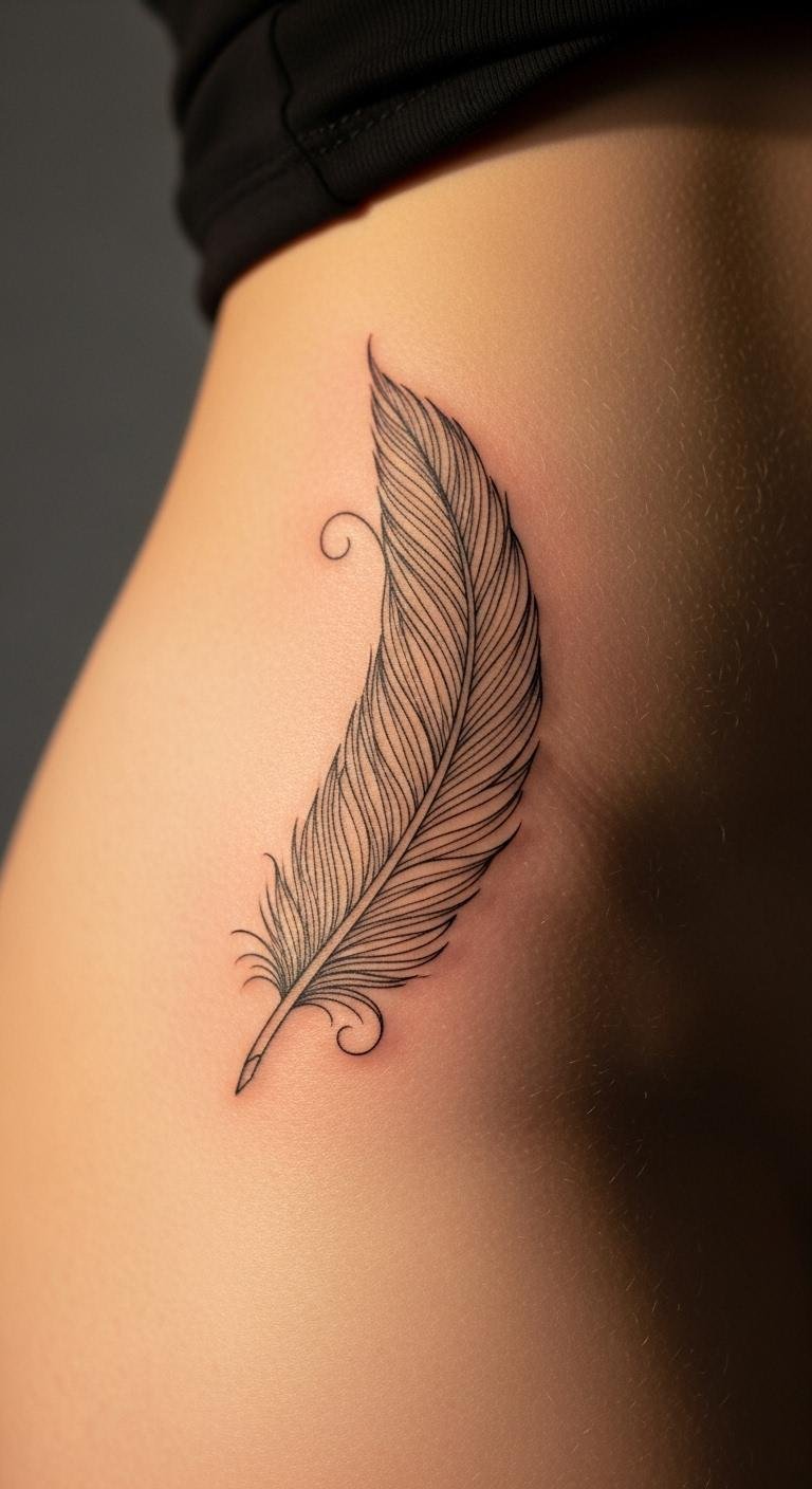 A fine line feather on your hip stands for freedom and lightness. It’s delicate and airy. Practice drawing feathers on paper. Virtual tools can help for free. Cost around $65. Curve it with your hip. Make it unique with added patterns. This design lifts your spirit. Try temporary ones first. Heal simply. It’s an elegant touch.