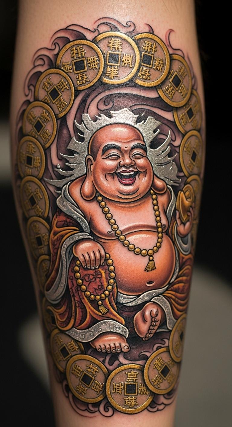 Coins around Buddha symbolize wealth and success, turning the tattoo into a luck magnet.