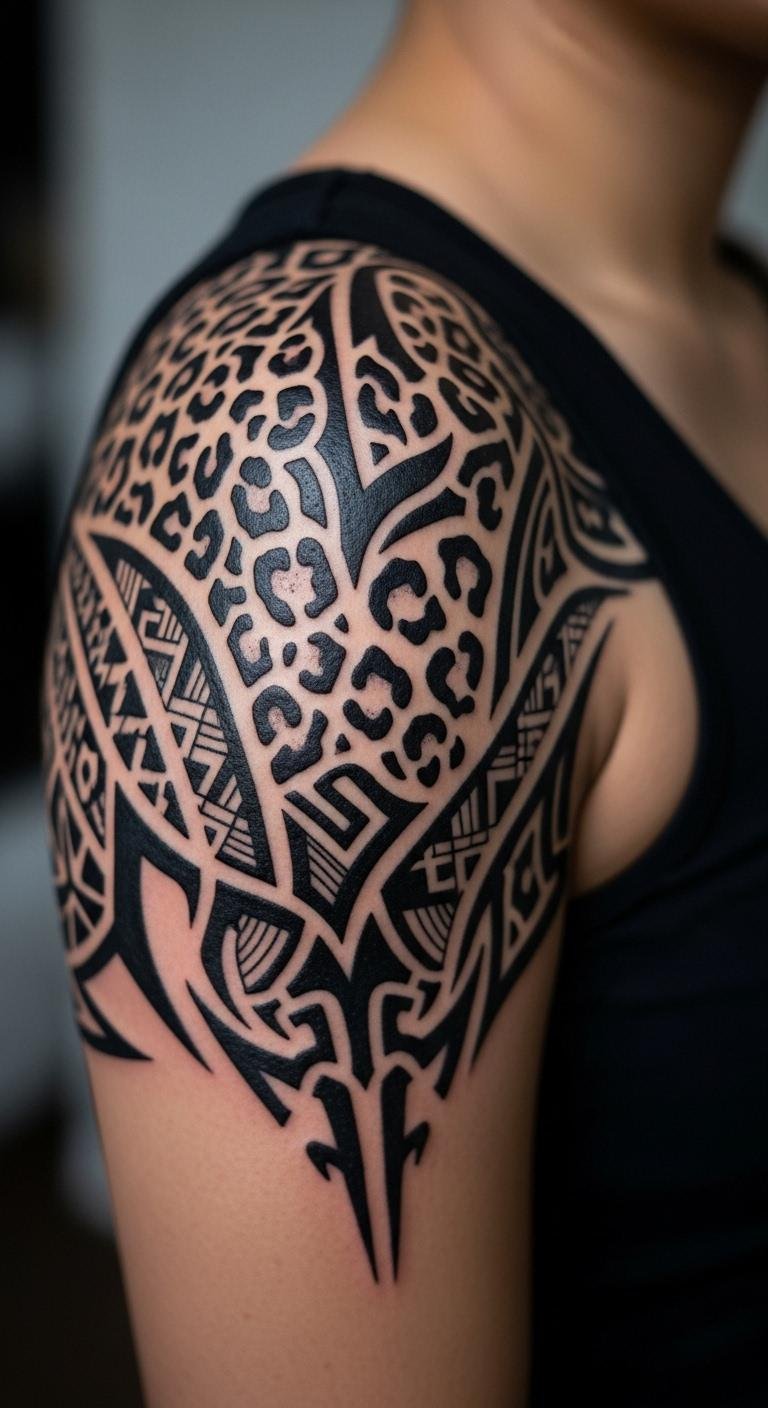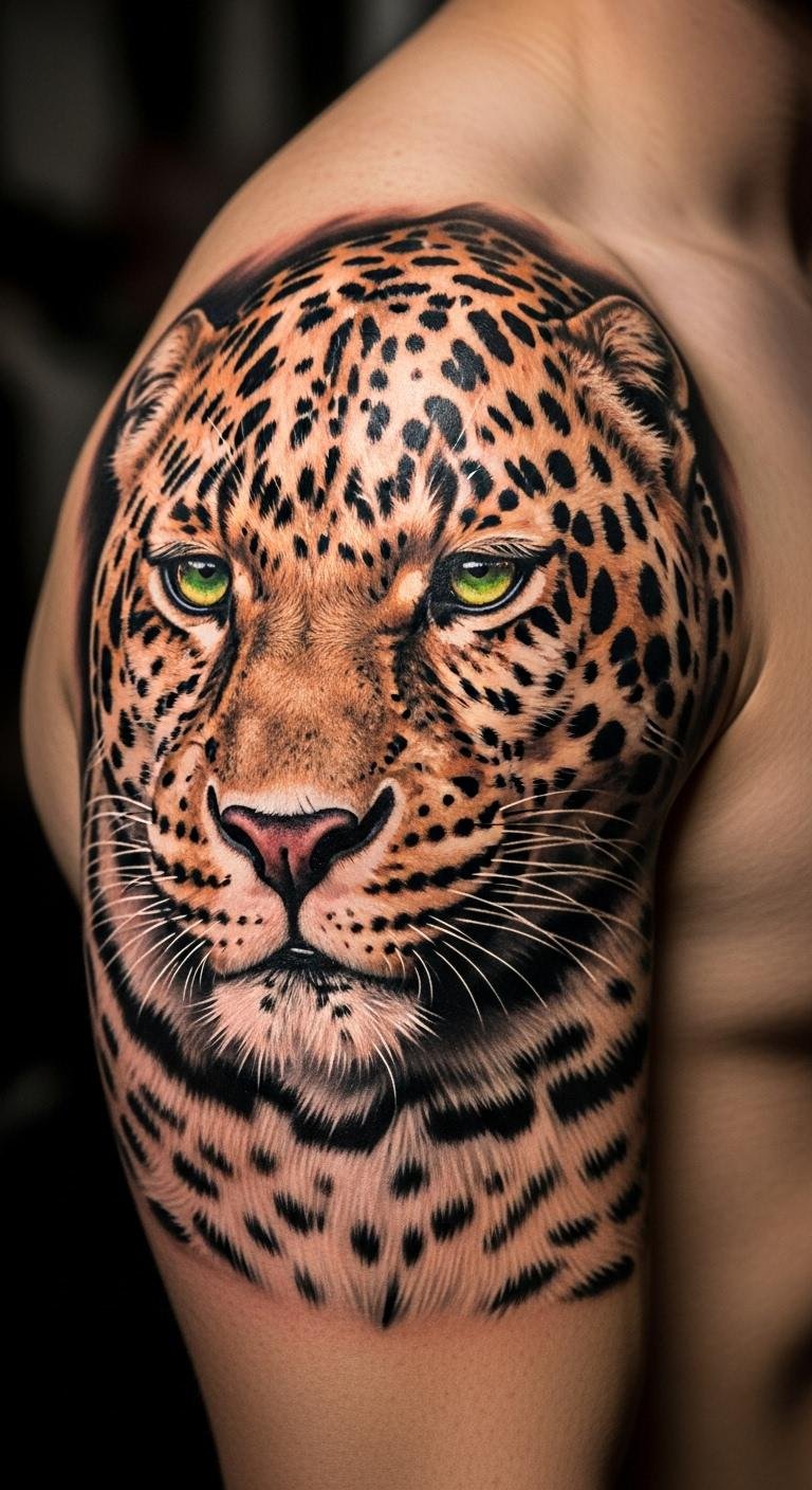 Shoulder leopard tattoos show off strength. They feature full faces or patterns. Select a powerful design. Search shoulder references for free. Draw it on paper with details. This saves on initial costs. Place it on the blade. Shoulder designs highlight movement. Use body mirrors for planning. Opt for medium sizes. They work under shirts. Find experienced artists. This gets bold results. Practice sketches at home. Shoulder tattoos make a statement.