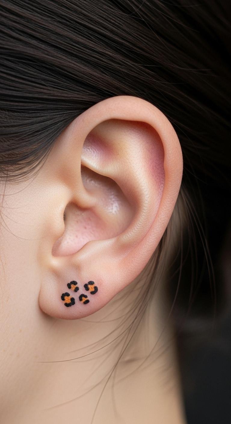 Behind ear leopard tattoos are super subtle. They add a secret wild touch. Choose a mini spot. Look for ear templates online. Draw it with a thin marker. This is an affordable start. Place it just behind the lobe. Ear designs keep things hidden. Use a small mirror to position. Go for black dots. They peek out occasionally. Select precise artists. This ensures neatness. Test with stickers first. Ear tattoos are quick and easy.