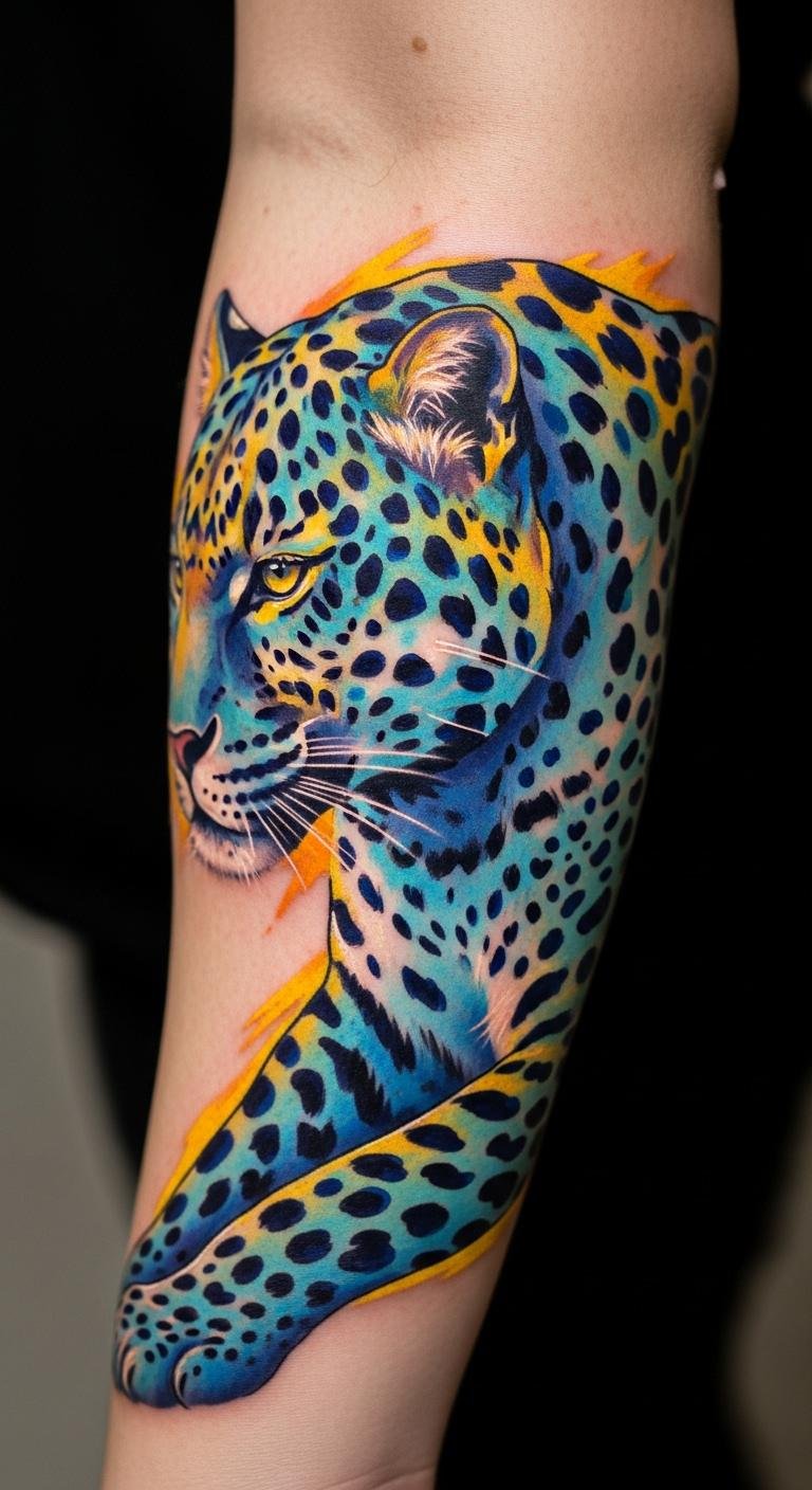 Colorful leopard tattoos add hues like blue. They brighten the wild theme. Choose spot colors. Find color palettes online. Draw with colored pencils. This is budget-friendly prep. Place it on arms. Colorful designs pop. Use digital editors for ideas. Opt for a few shades. They enhance outfits. Select artists for color work. This gets vivid results. Test with paints. Colorful tattoos energize.
