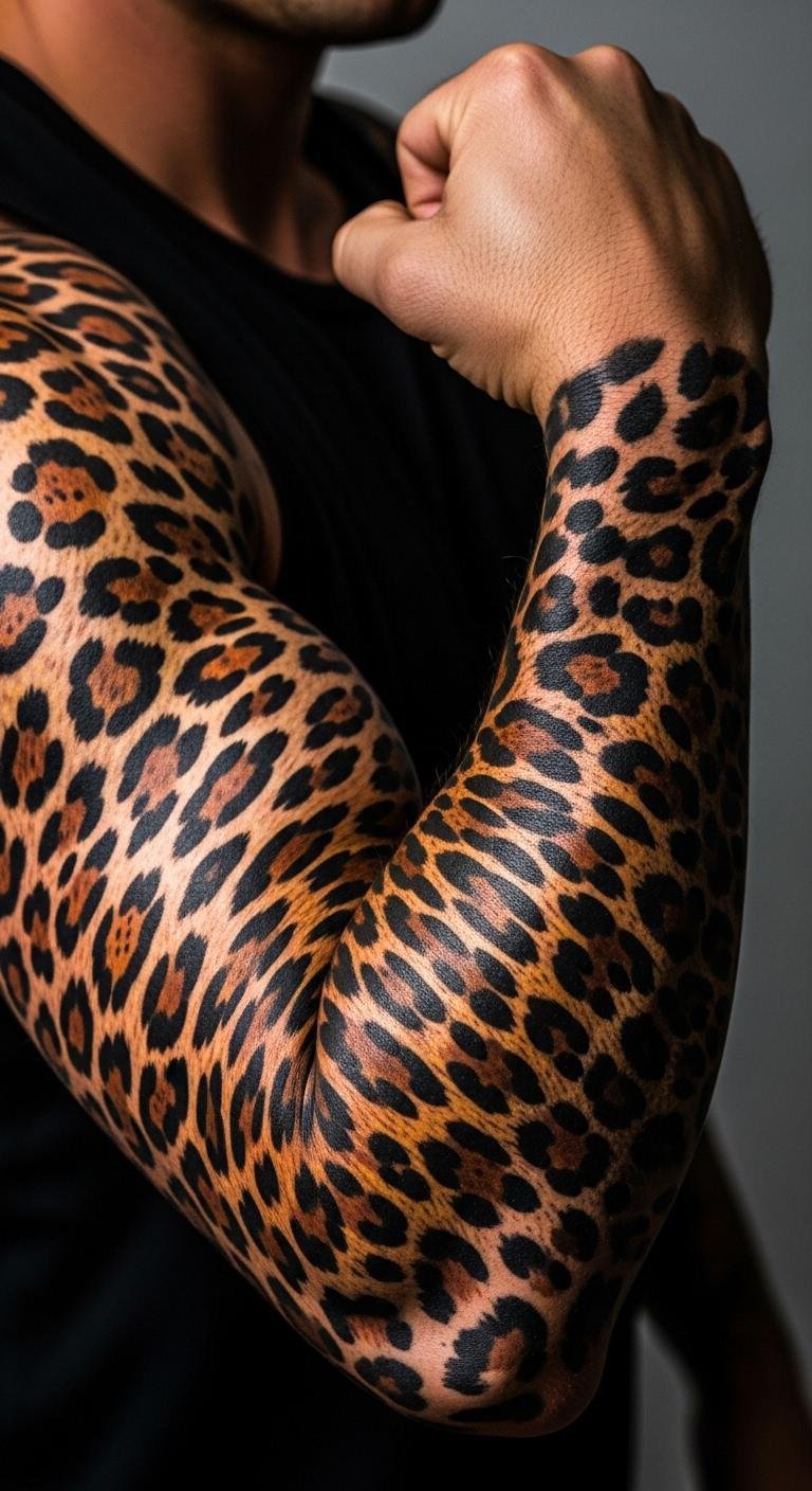 Bold arm leopard tattoos cover with fierceness. They show full force. Select arm-filling designs. Find bold references online. Draw the coverage. This helps with budgeting. Place it along arms. Bold designs command attention. Use arm templates. Opt for dense patterns. They make an impact. Choose strong artists. This ensures durability. Test with wraps. Bold tattoos empower.