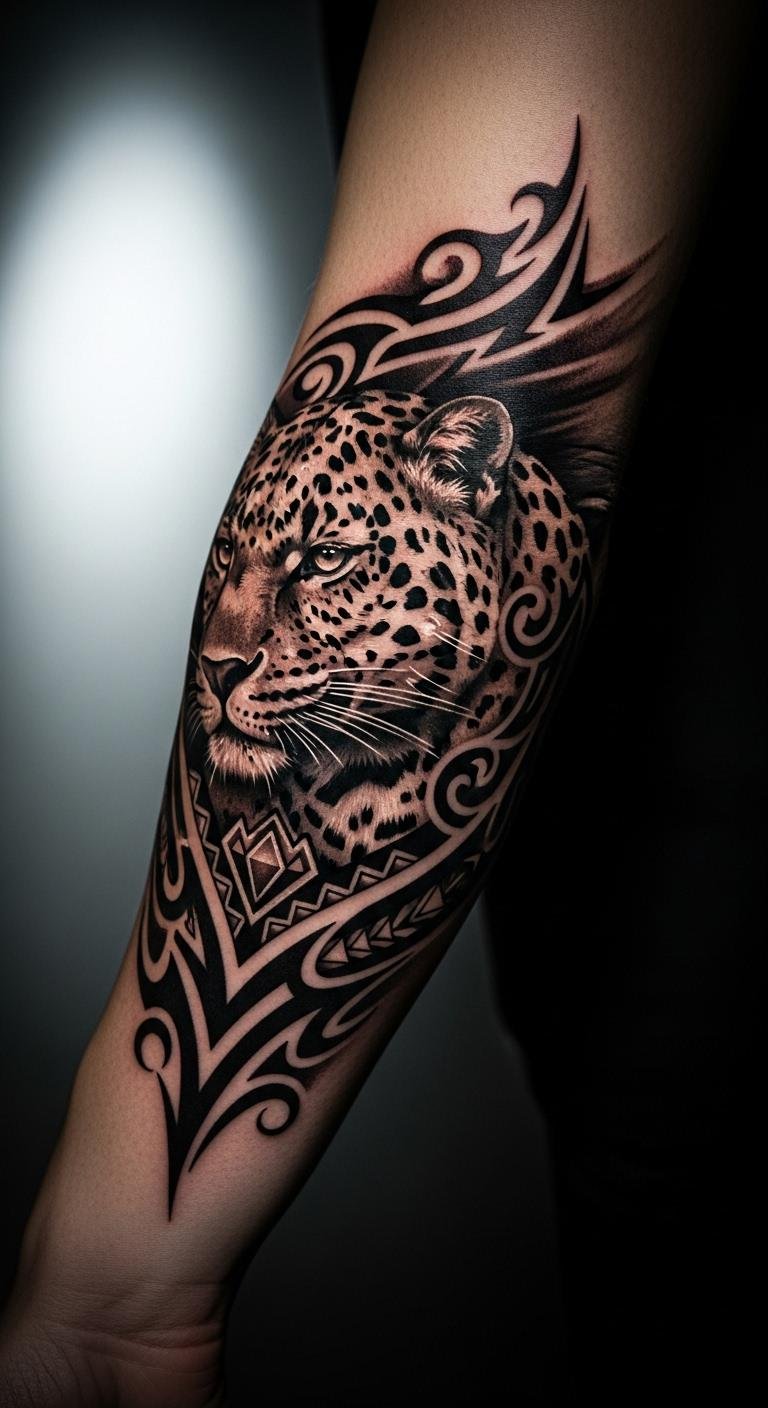 Fusion style leopard tattoos combine elements like geometric and tribal. They create unique hybrids. Choose a mix of shapes and lines. Look for free fusion ideas on the web. Draw combined patterns with markers. This keeps things affordable. Place them on forearms for versatility. Fusion designs offer fresh takes. Use digital tools to merge styles. Opt for simple inks to start. They adapt to your personality. Select artists who experiment. This ensures a custom feel. Test on paper before going ahead. Fusion tattoos spark creativity.