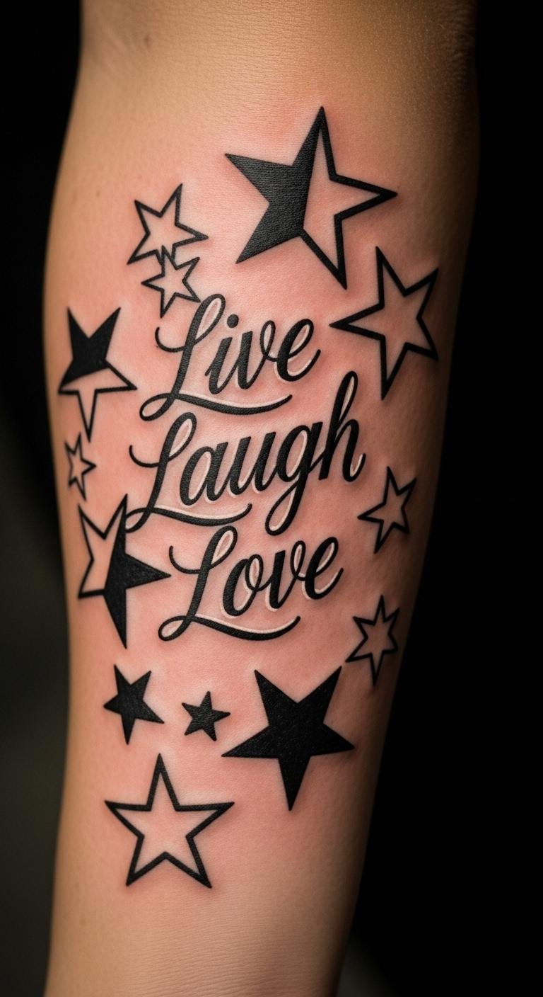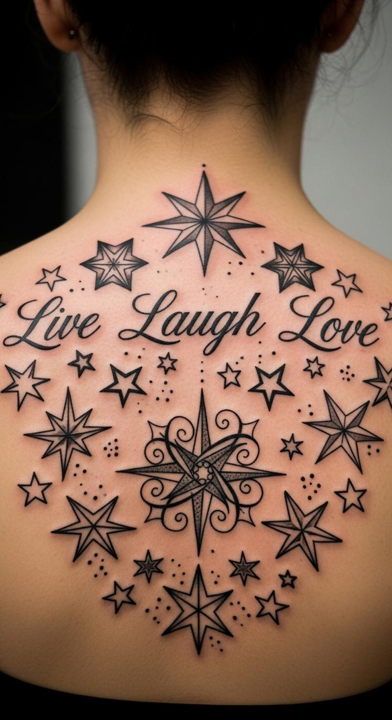 Stars around “Live Laugh Love” on your back add a fun, starry vibe.