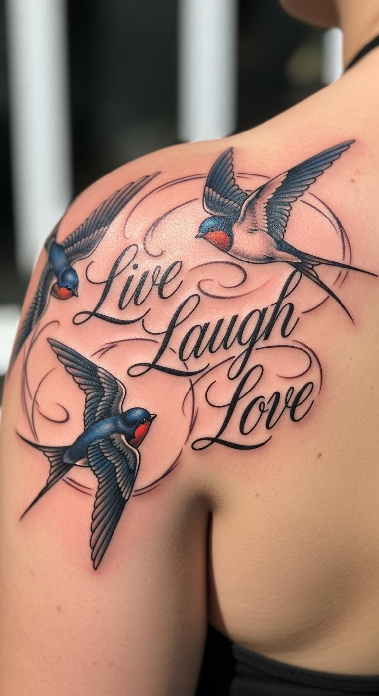 Swallows with “Live Laugh Love” symbolize freedom and flight.