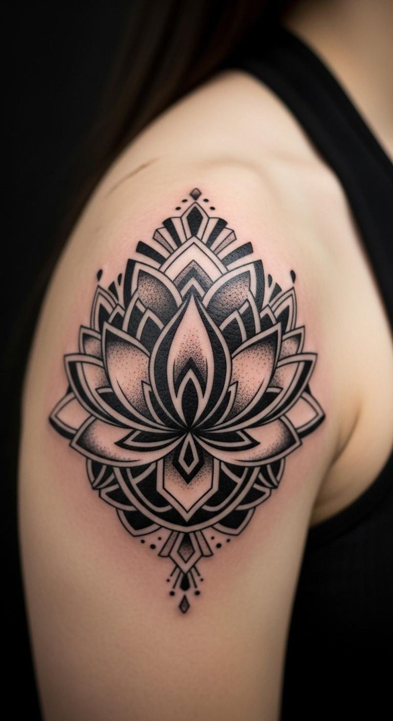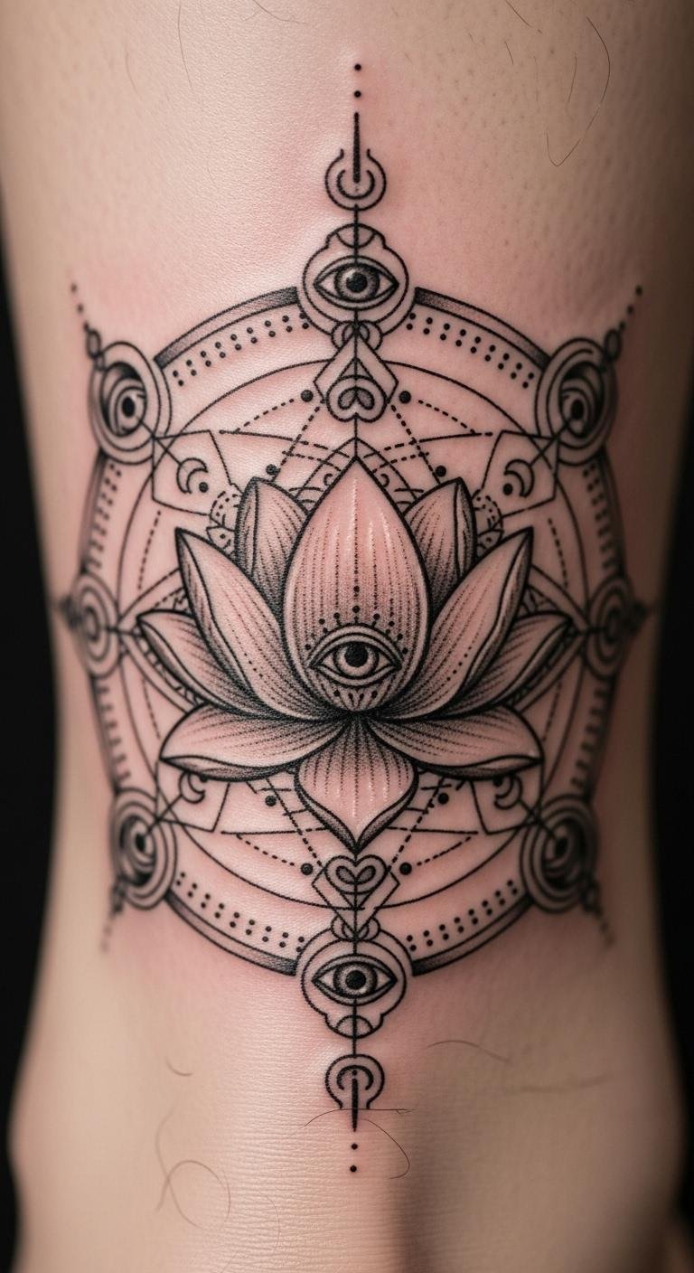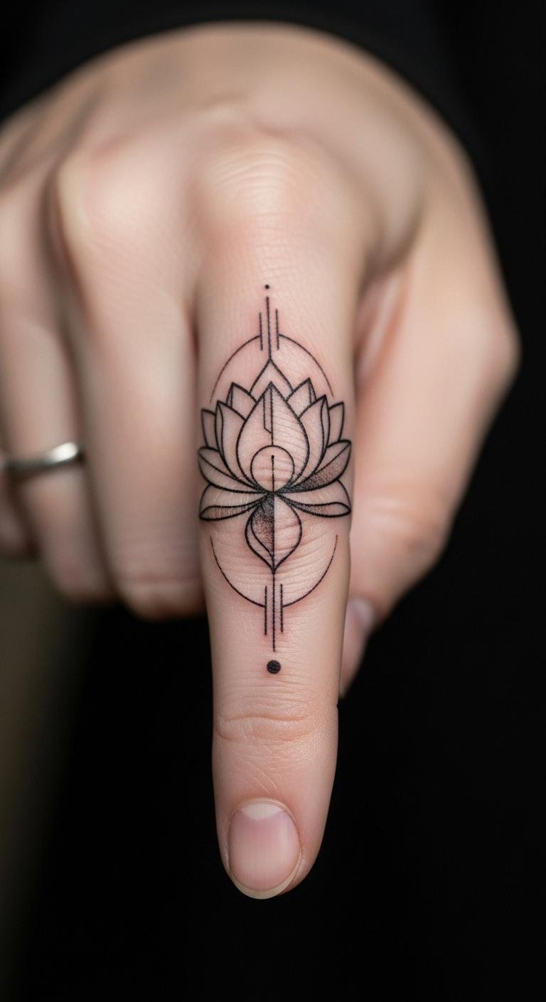 Geometric styles add a modern edge to the classic lotus. Shapes like triangles mix with petals for a cool vibe. It stands for strength and balance in life. Draw shapes on paper first. Use a ruler for straight lines. This keeps things neat. Budget tip: Find geometric stencils online for $2–$5 and trace them yourself. Try a temporary version with henna, which costs about $8 a pack. Place it on your arm to test. Artists might offer geometric add-ons for less than a full design. Keep your routine simple. Wear it proudly on visible spots. This design fits everyday life without hassle.