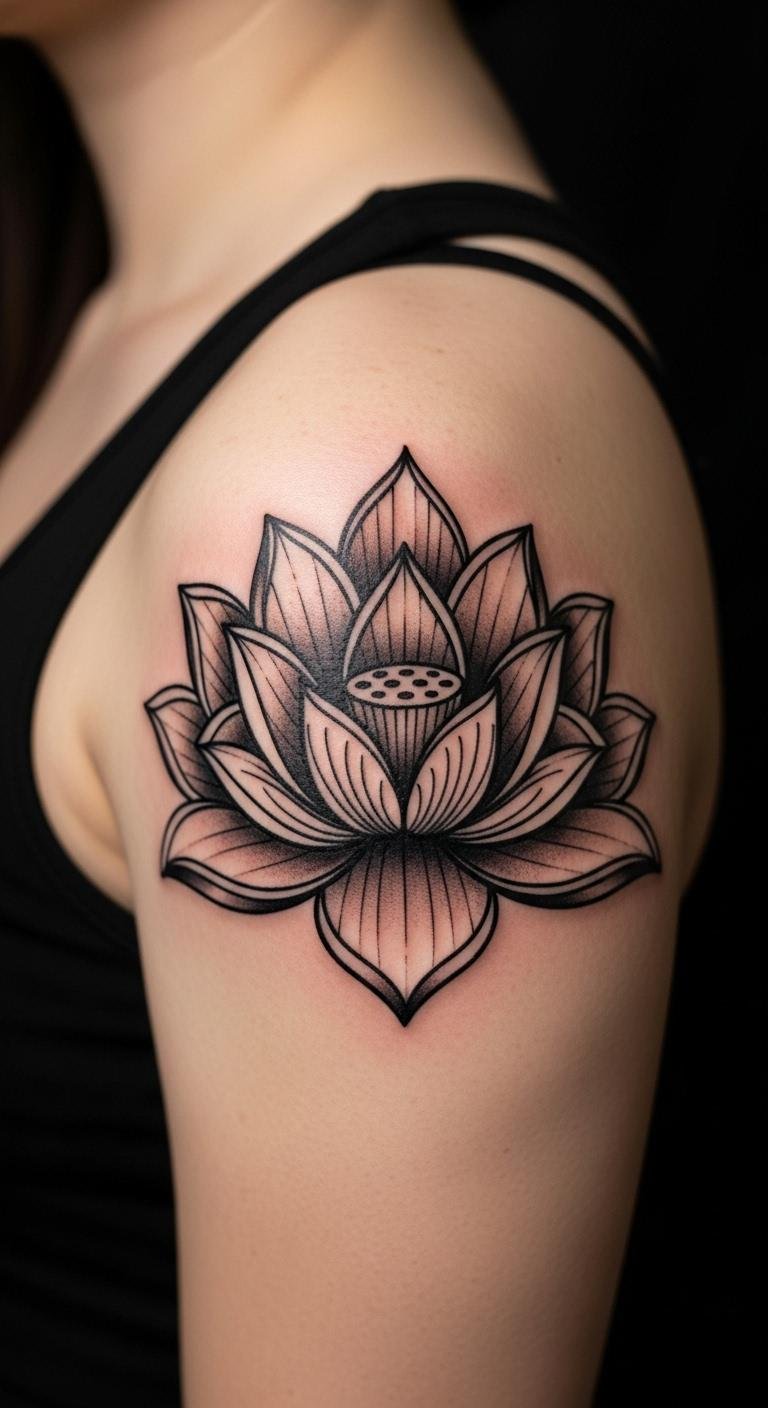 Blackwork makes the lotus bold and striking. Thick lines show inner strength. Shade in areas with a black pen first. Budget tip: Black markers cost $2 for practice. Temporary bold designs are $7. Studios do these fast for $50. It’s a statement piece.