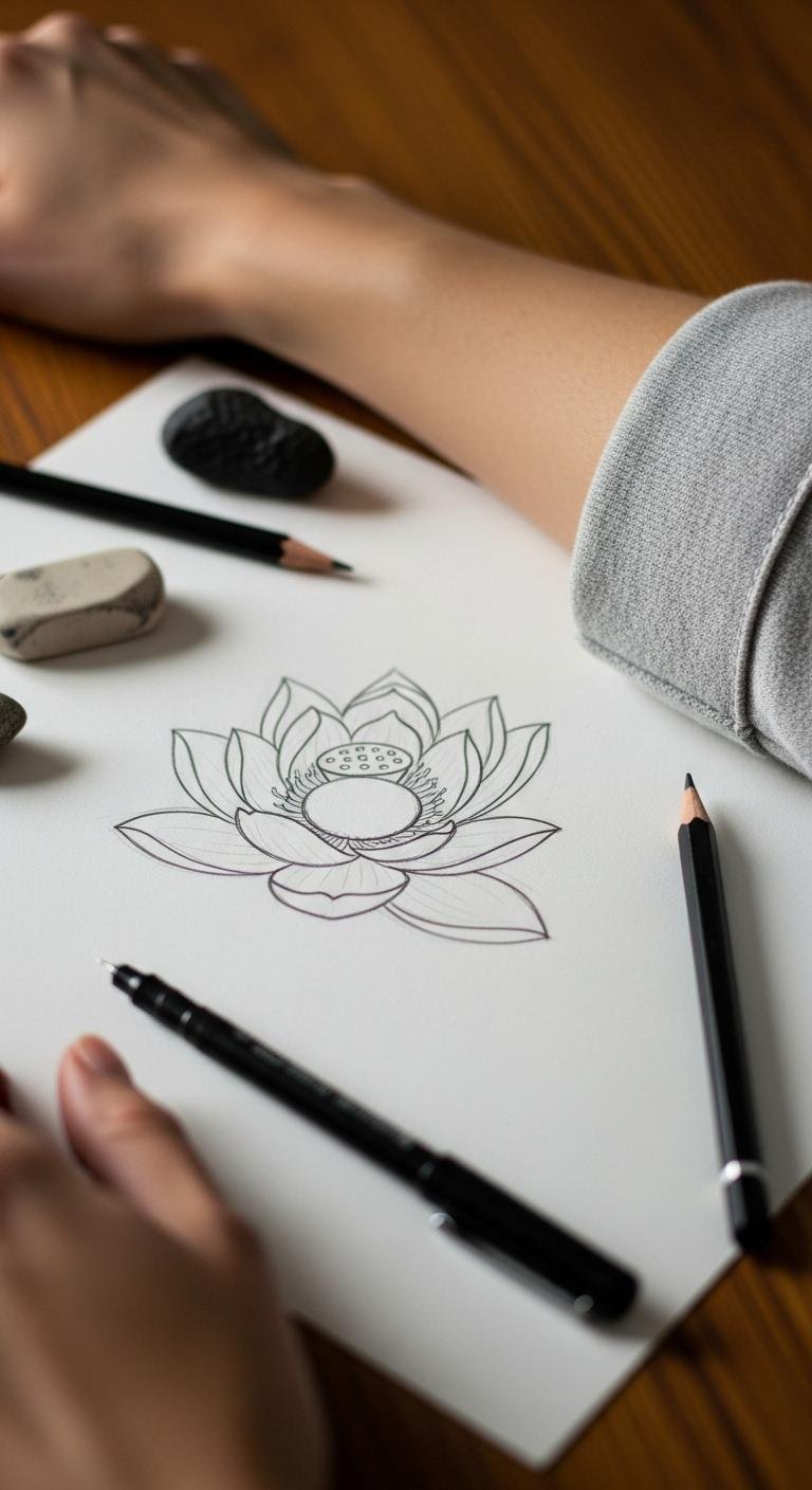 Think simple lines for a timeless look. A minimalist black and white lotus says a lot with little ink. It’s all about purity and fresh starts. Start with a basic sketch on paper. Use a pen to draw your design. This helps you see how it fits. Budget tip: Download free templates online and print them at home for under $5. Practice on your skin with a temporary tattoo kit, costing around $10. Talk to a local artist for quick sessions. They often have deals for small tattoos. Keep it personal. Add a small twist, like a tiny stem, to reflect your story. Easy steps make this idea approachable. No need for fancy tools. Just grab what you have and try it. You’ll feel empowered right away.