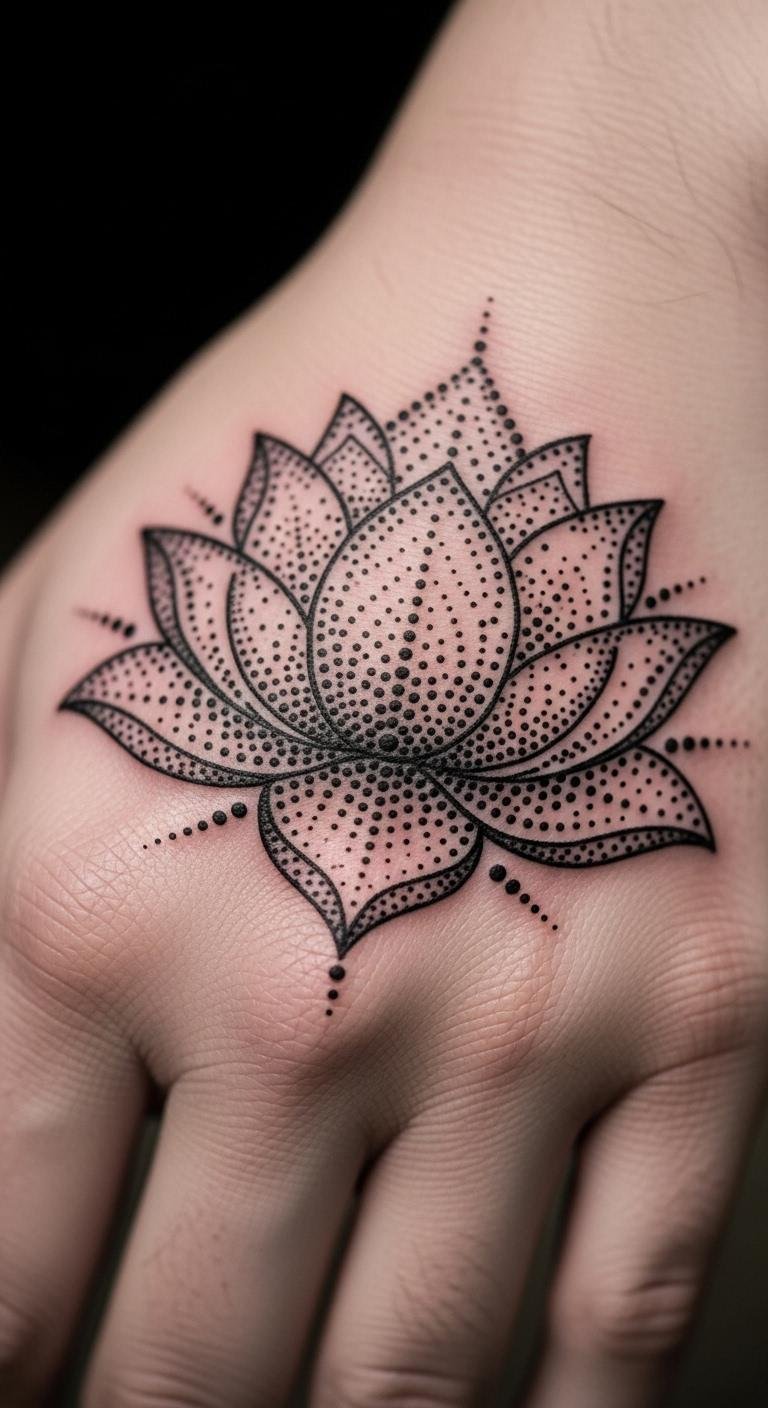 Dotwork gives the lotus an abstract, artistic feel. Dots build the petals for a unique look. Practice with a dot marker on paper. Budget tip: Get dot stickers for $3 to plan your layout. Temporary dot designs cost around $7. Artists can do this style quickly for less. Focus on the pattern’s flow. It’s easy to adapt.
