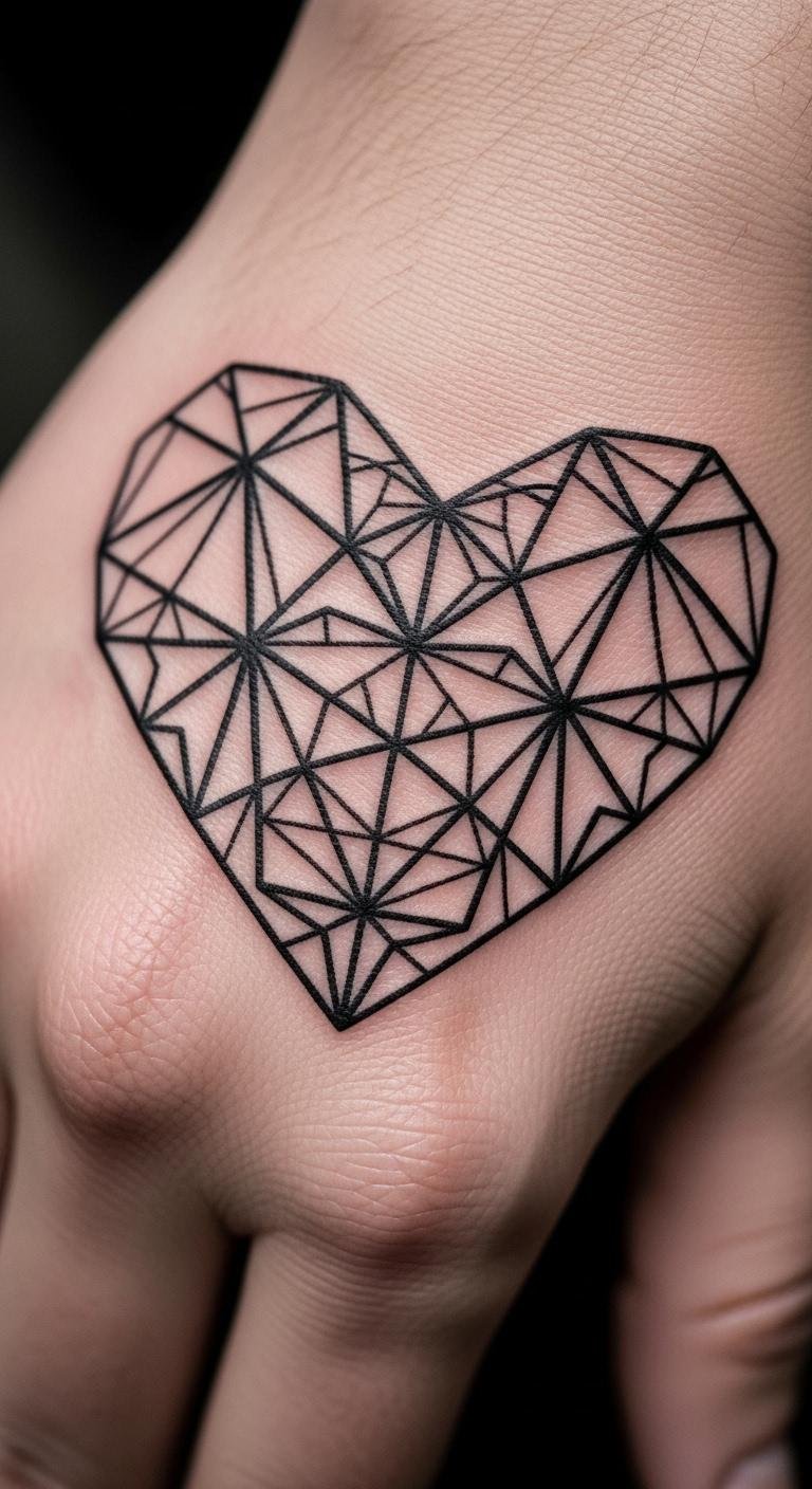 Geometric hearts use shapes for a modern edge. Cool and structured. Build one with graph paper. Apps assist with patterns. Deals start at $50. Test with rub-on designs. Layer in triangles for depth. Hand spots add style. Simple care keeps it sharp. Easy to try.