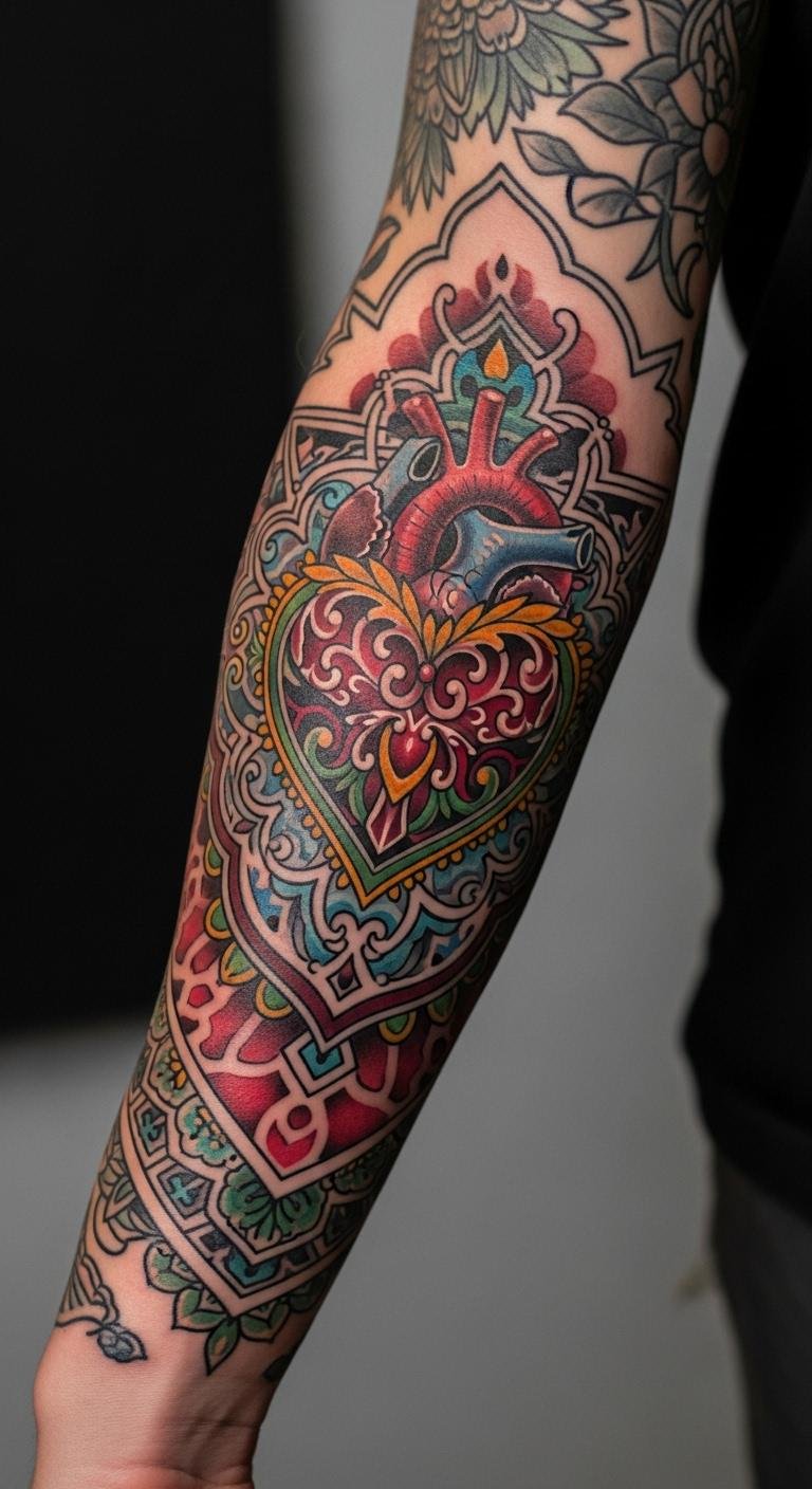 Sleeve hearts blend into larger art. Expansive and creative. Plan on paper first. Free tools build it. Phased sessions save cash. Fake sleeves preview. Include connecting lines. Arm for the flow. Lotion helps over time.