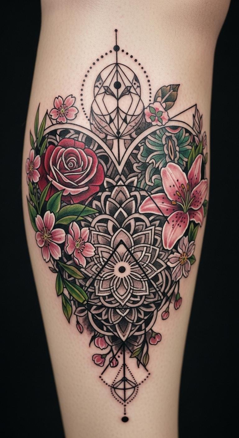 Geometric and Floral Heart Mix Tattoo